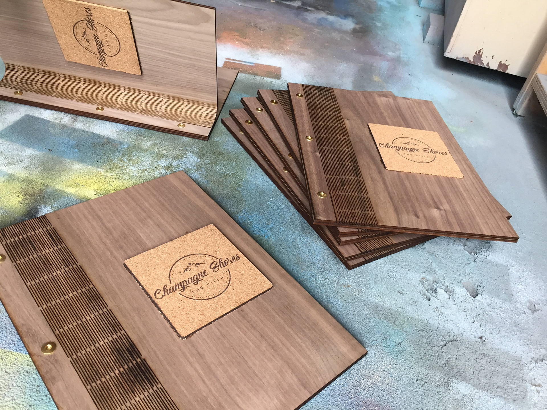 Cork and walnut Lattice Hinge Menu COvers