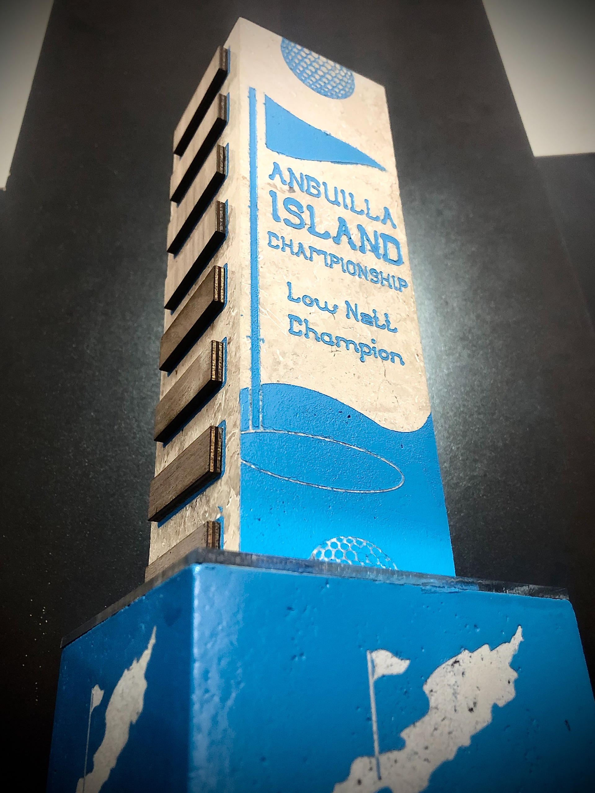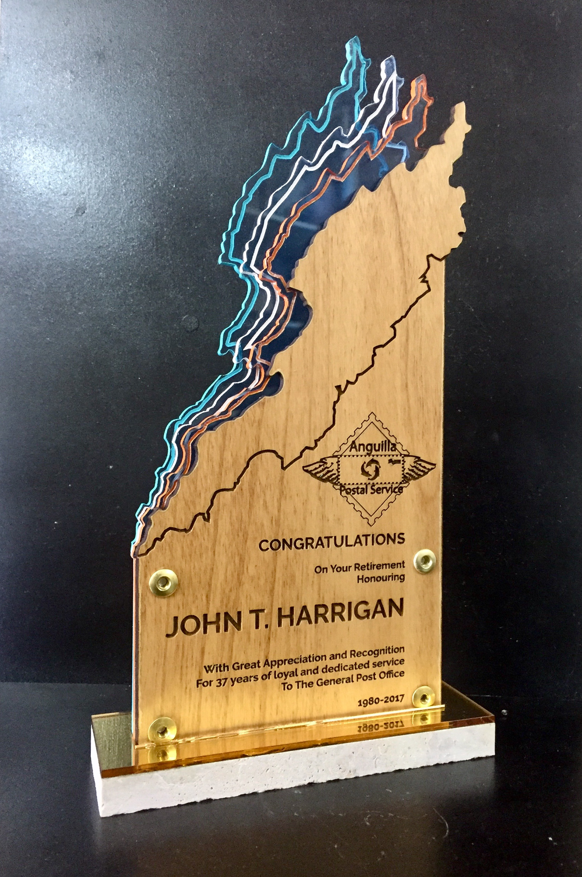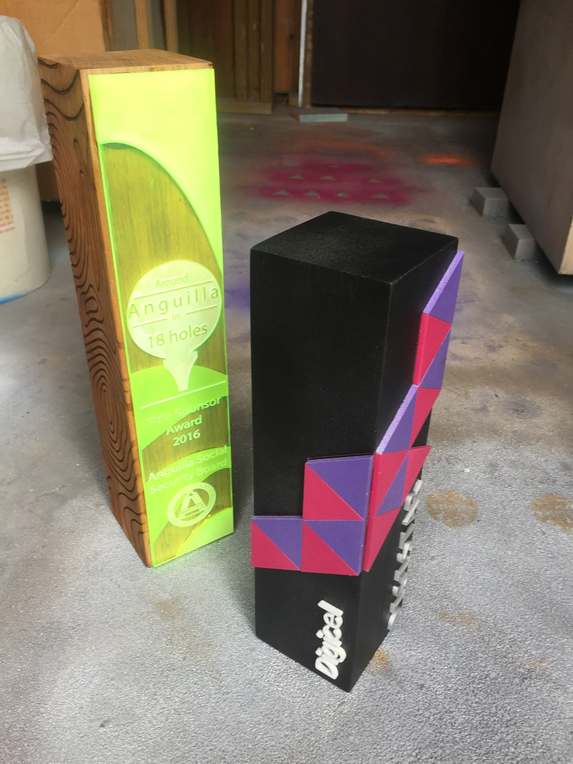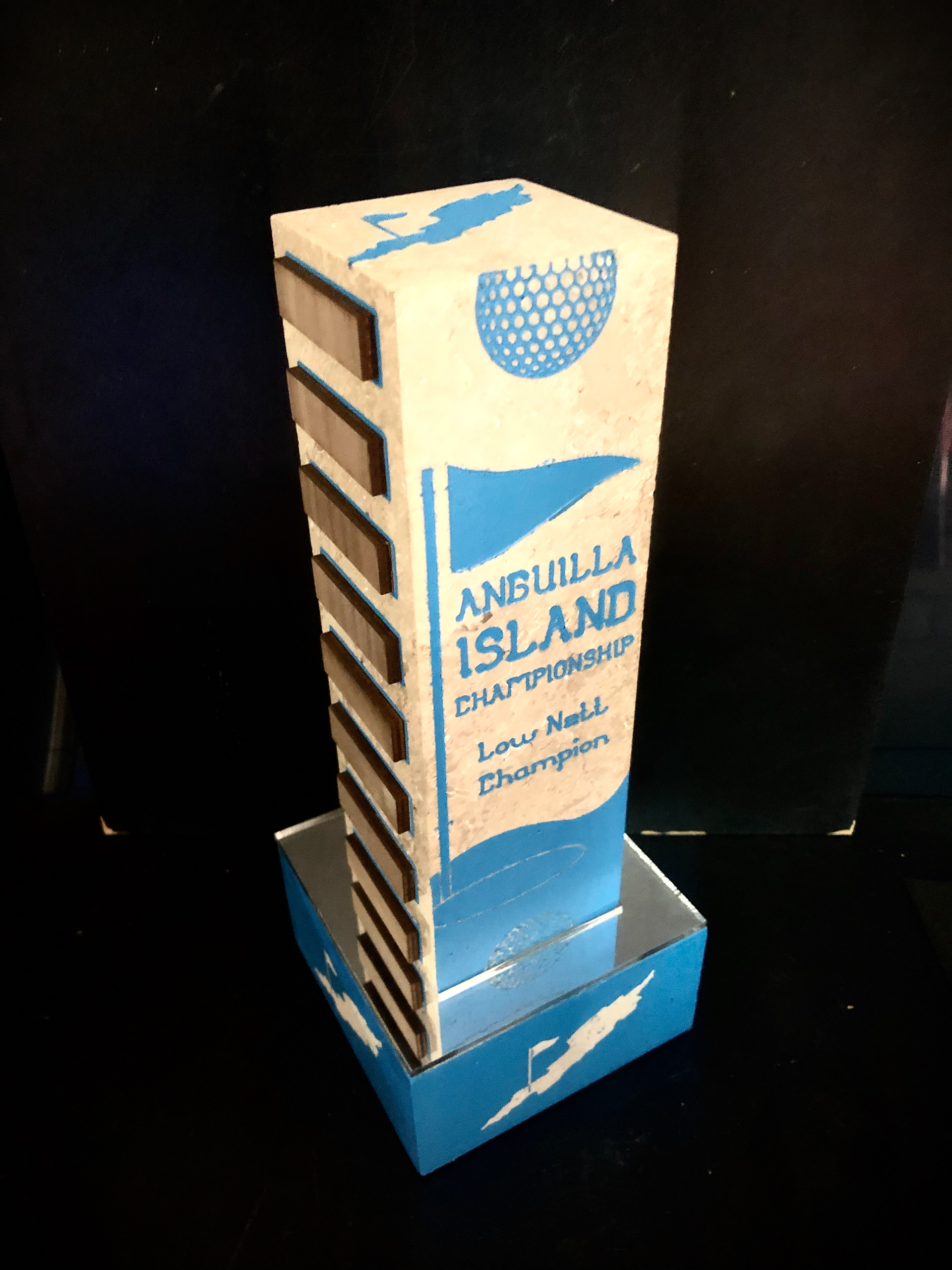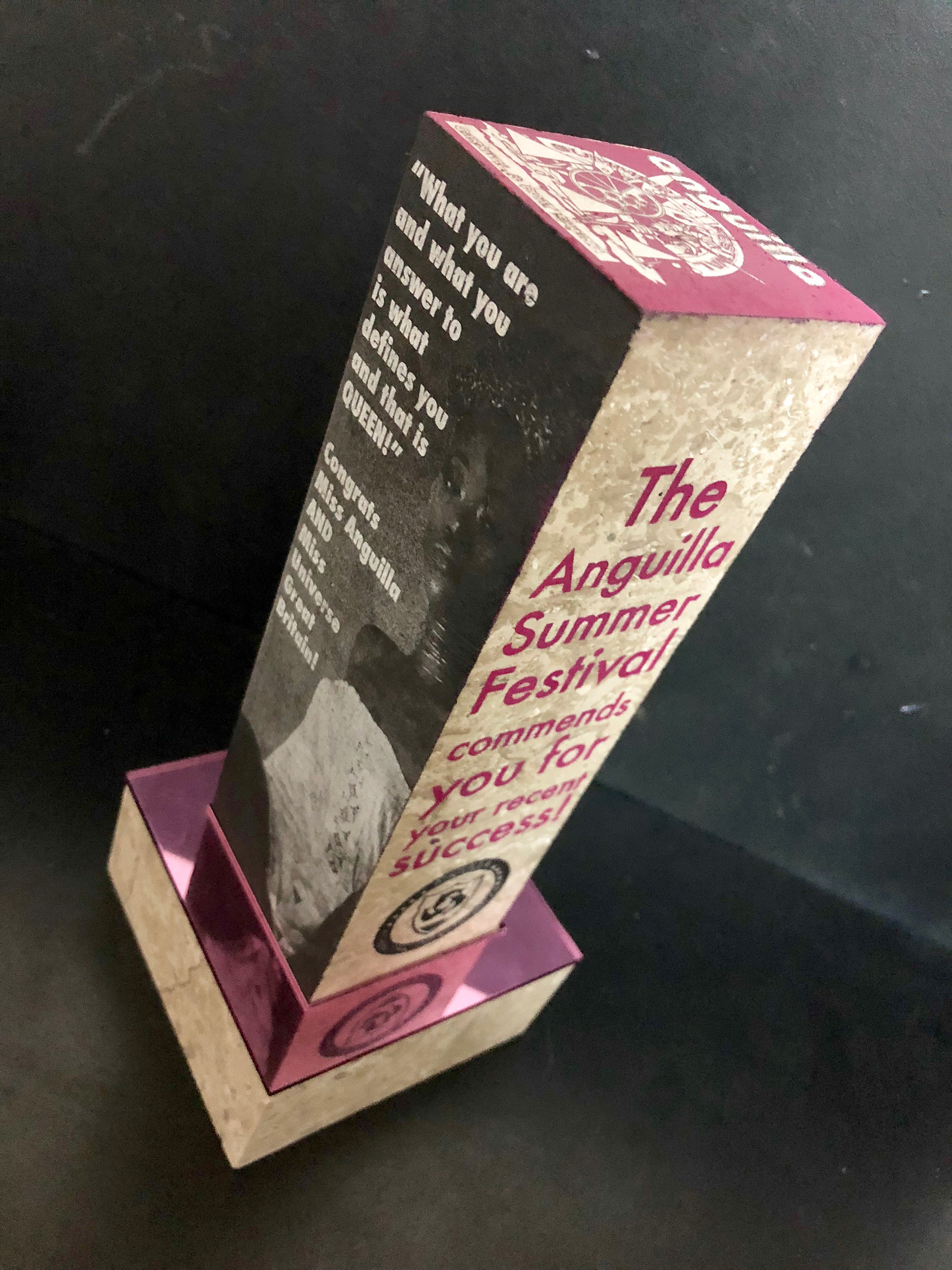 This award isĀ made with Authentic Anguilla Limestone, black aluminium screws, black acrylic, blueĀ mirrored acrylic, pink mirrored acrylicĀ and engraved and painted details.