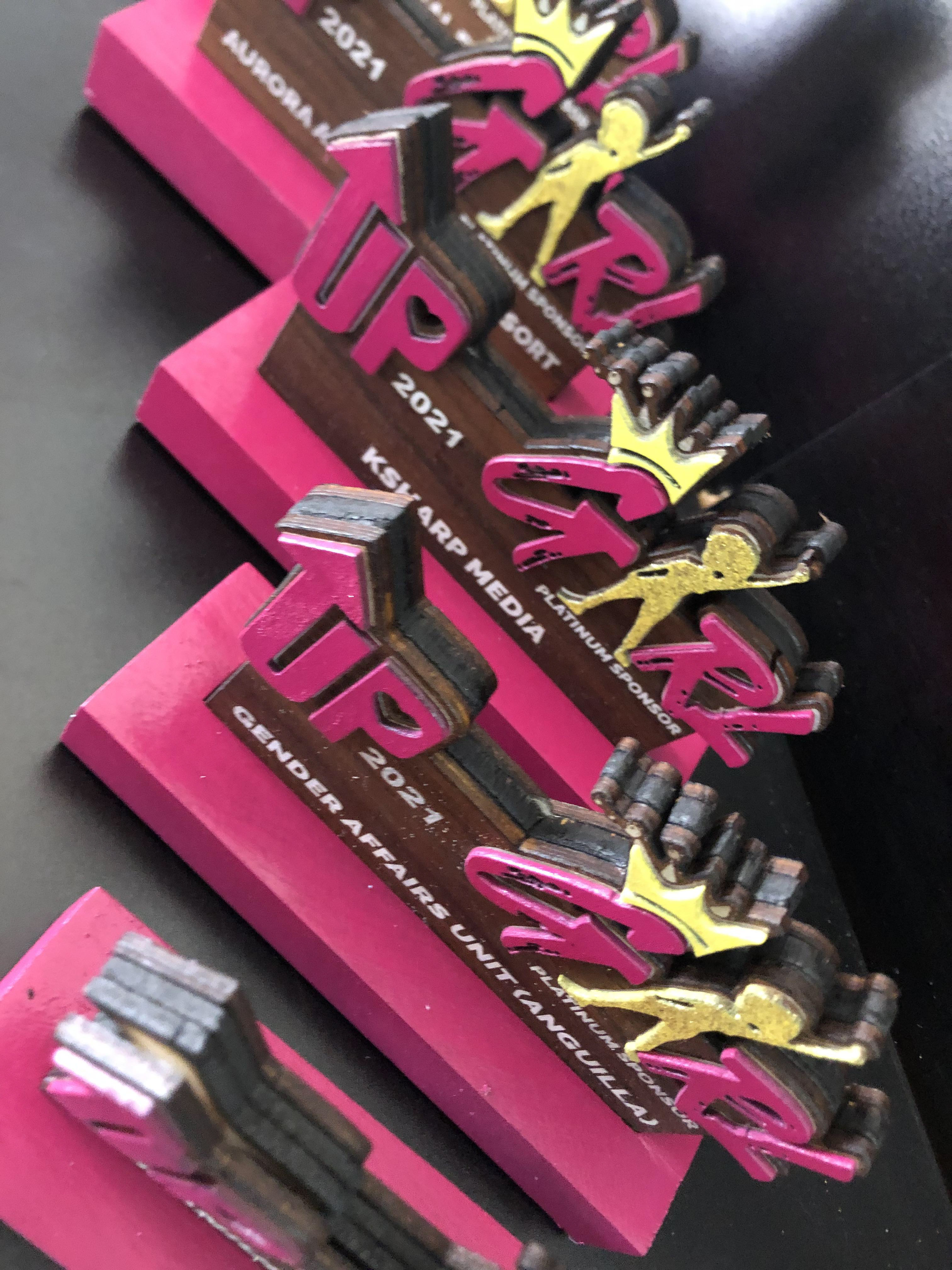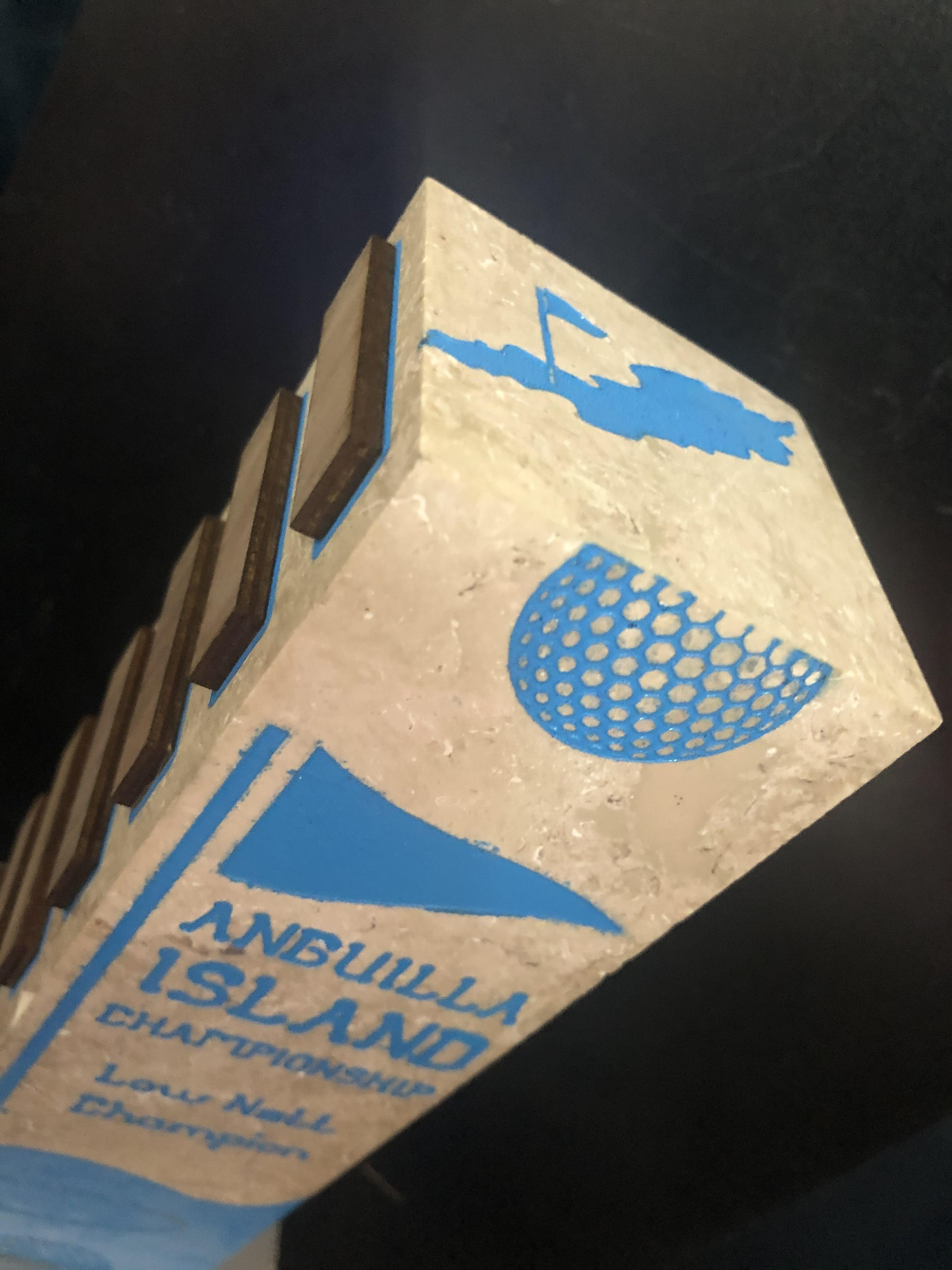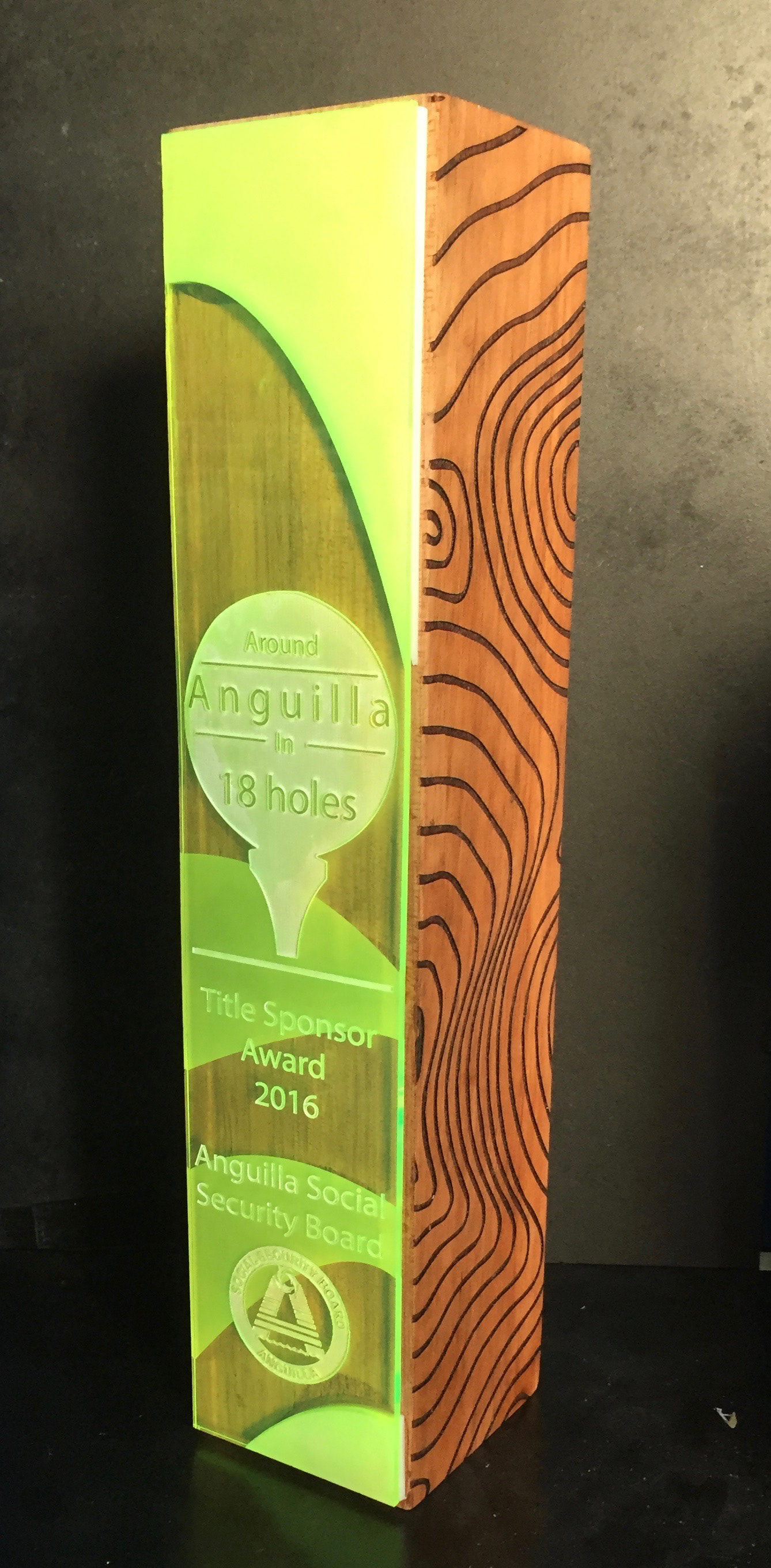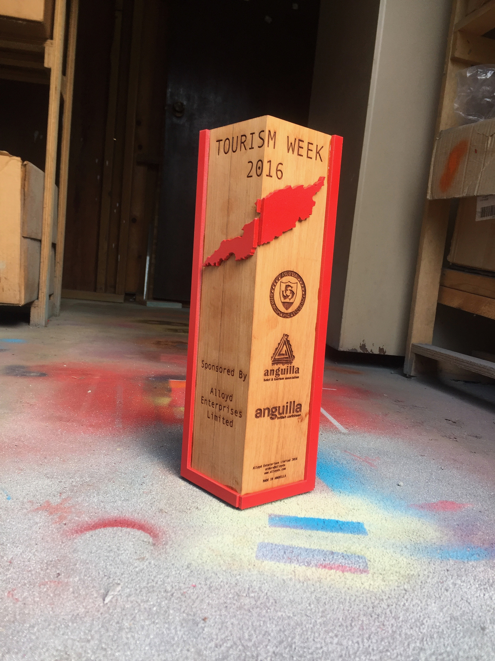 This award isĀ made with Authentic Anguilla Limestone, black aluminium screws, black acrylic, blueĀ mirrored acrylic, pink mirrored acrylicĀ and engraved and painted details.