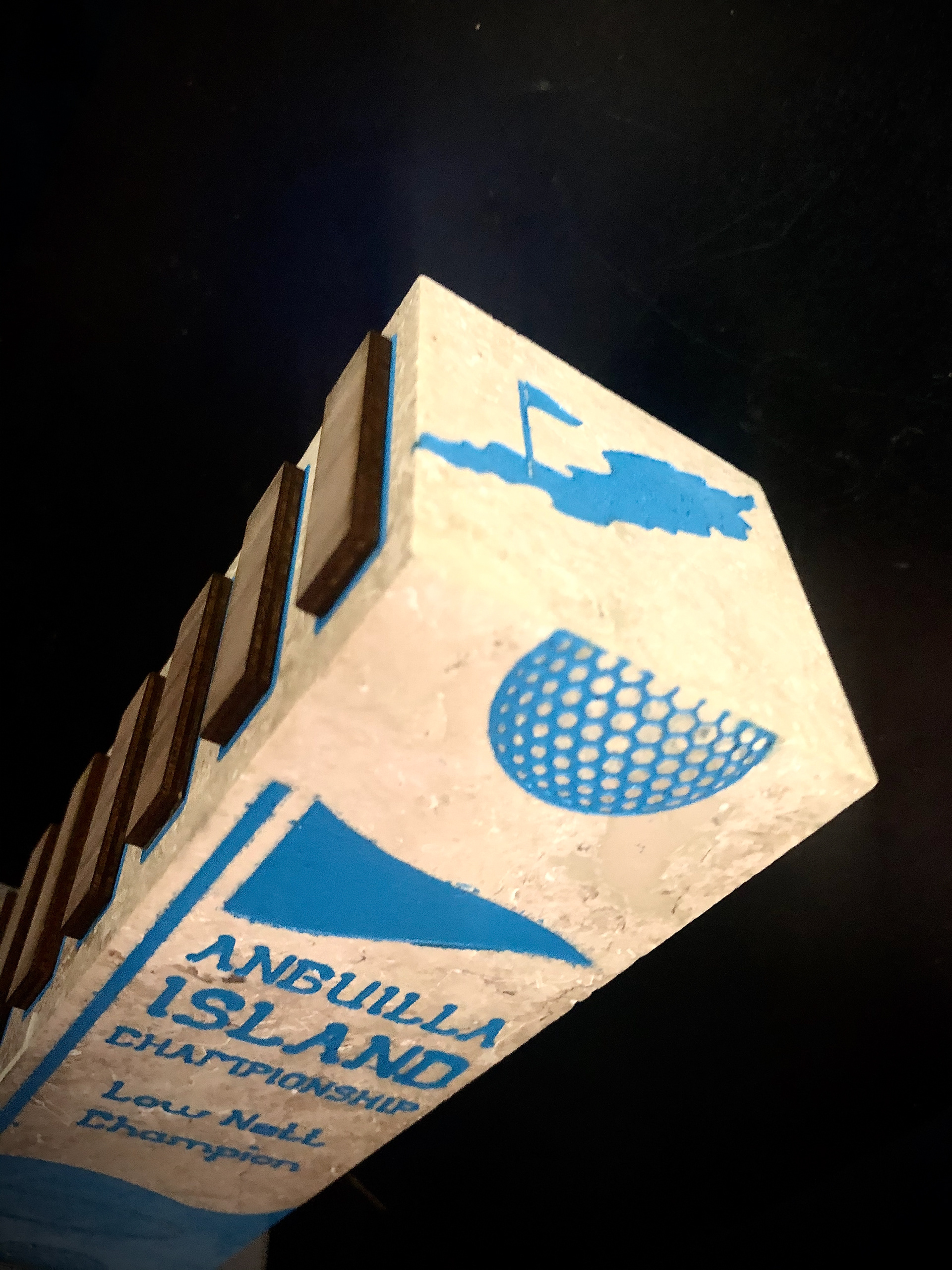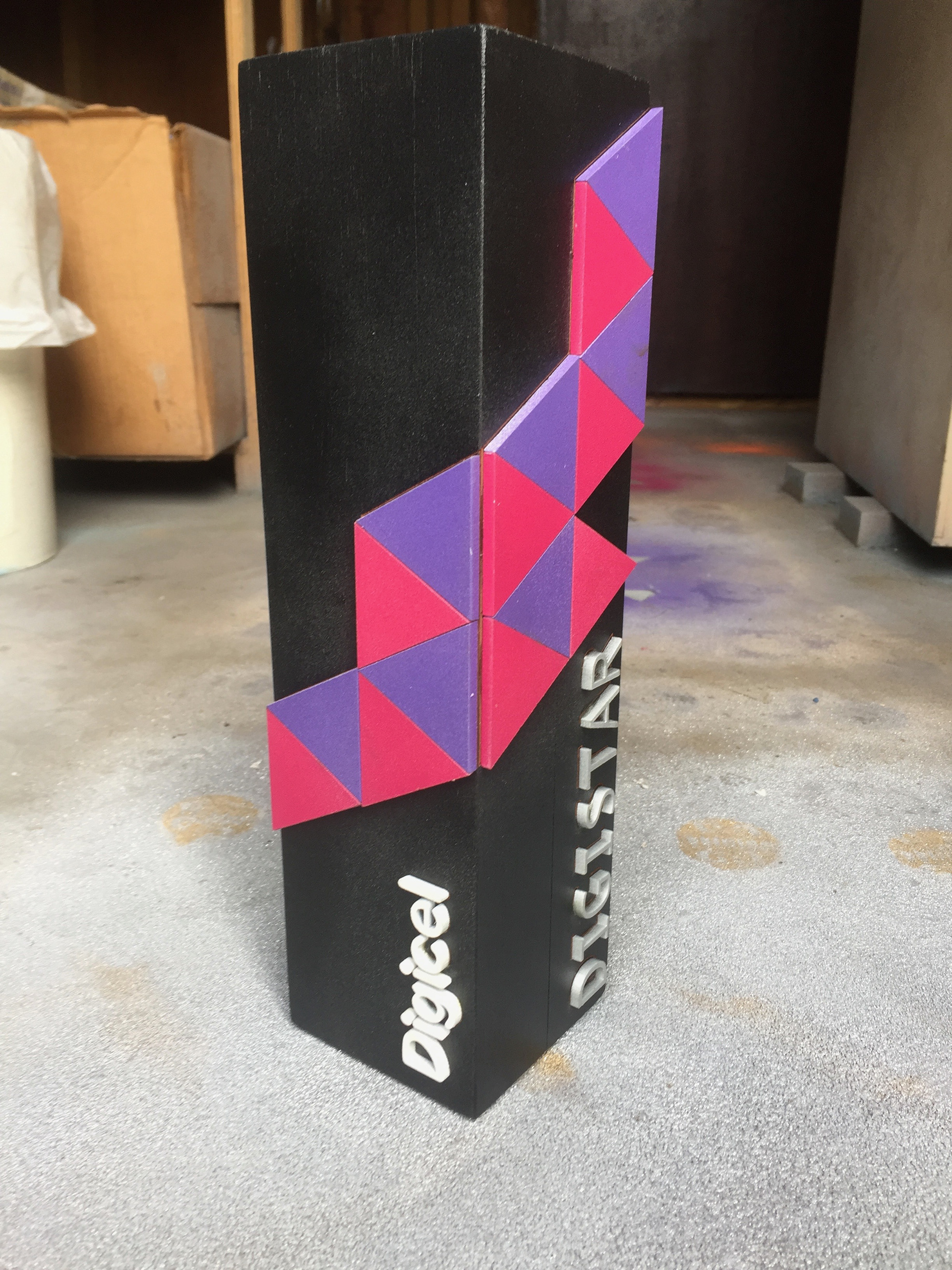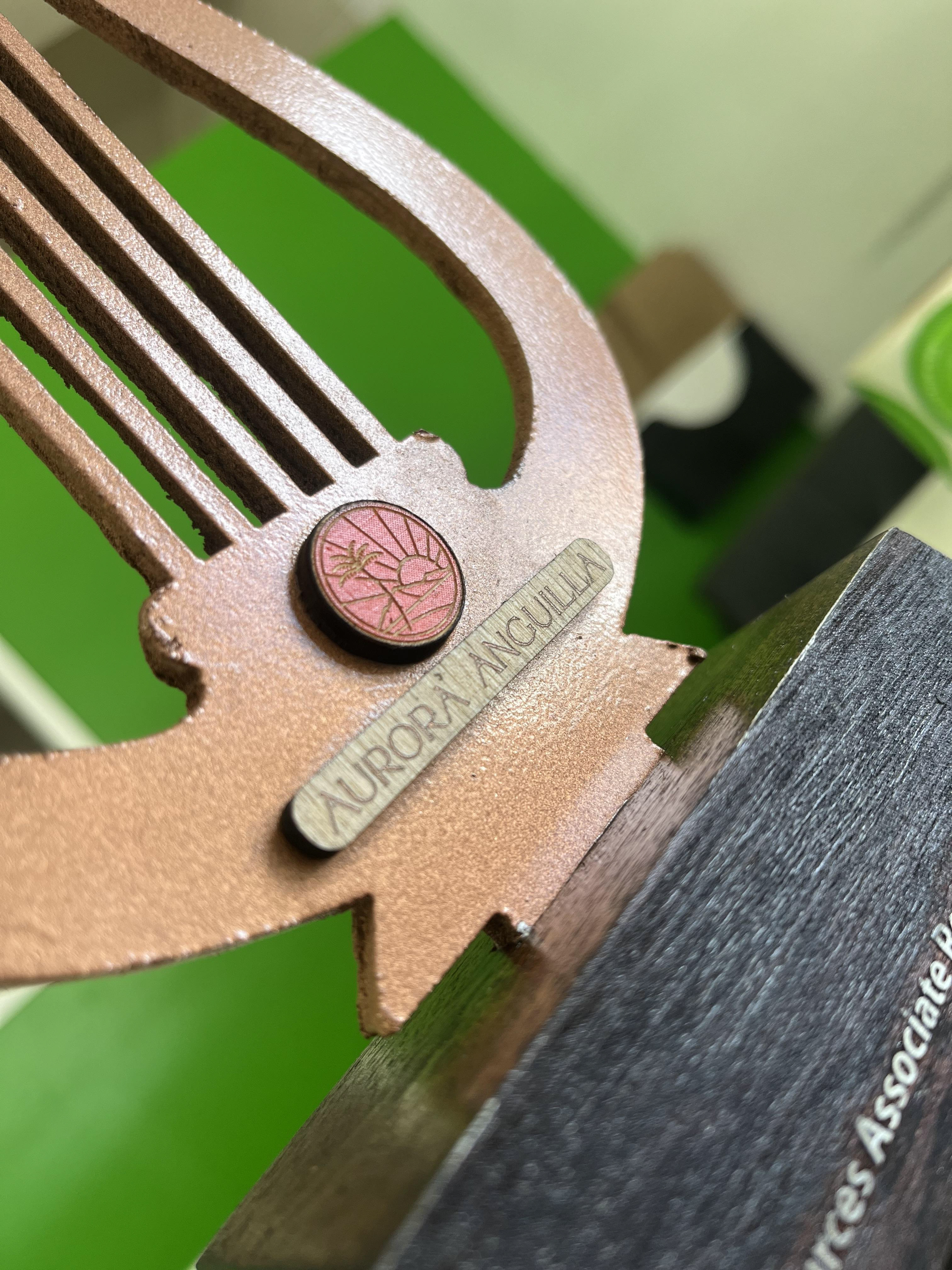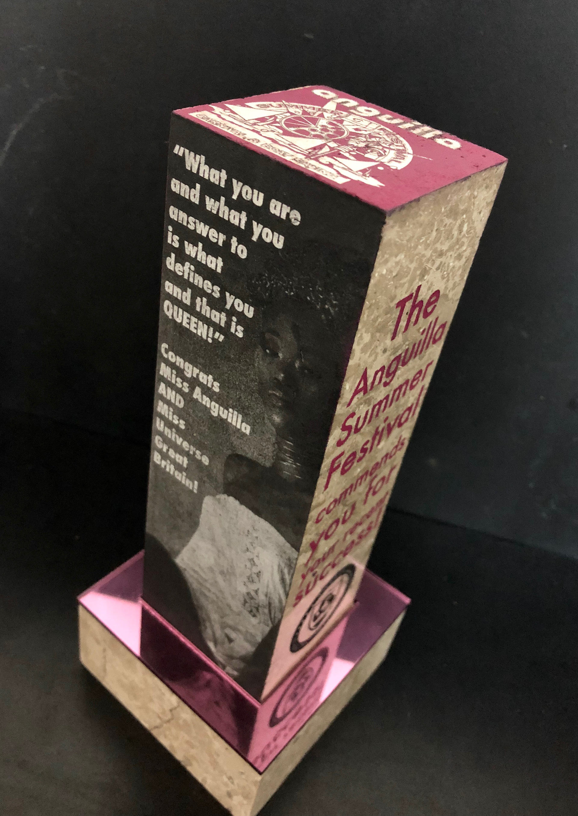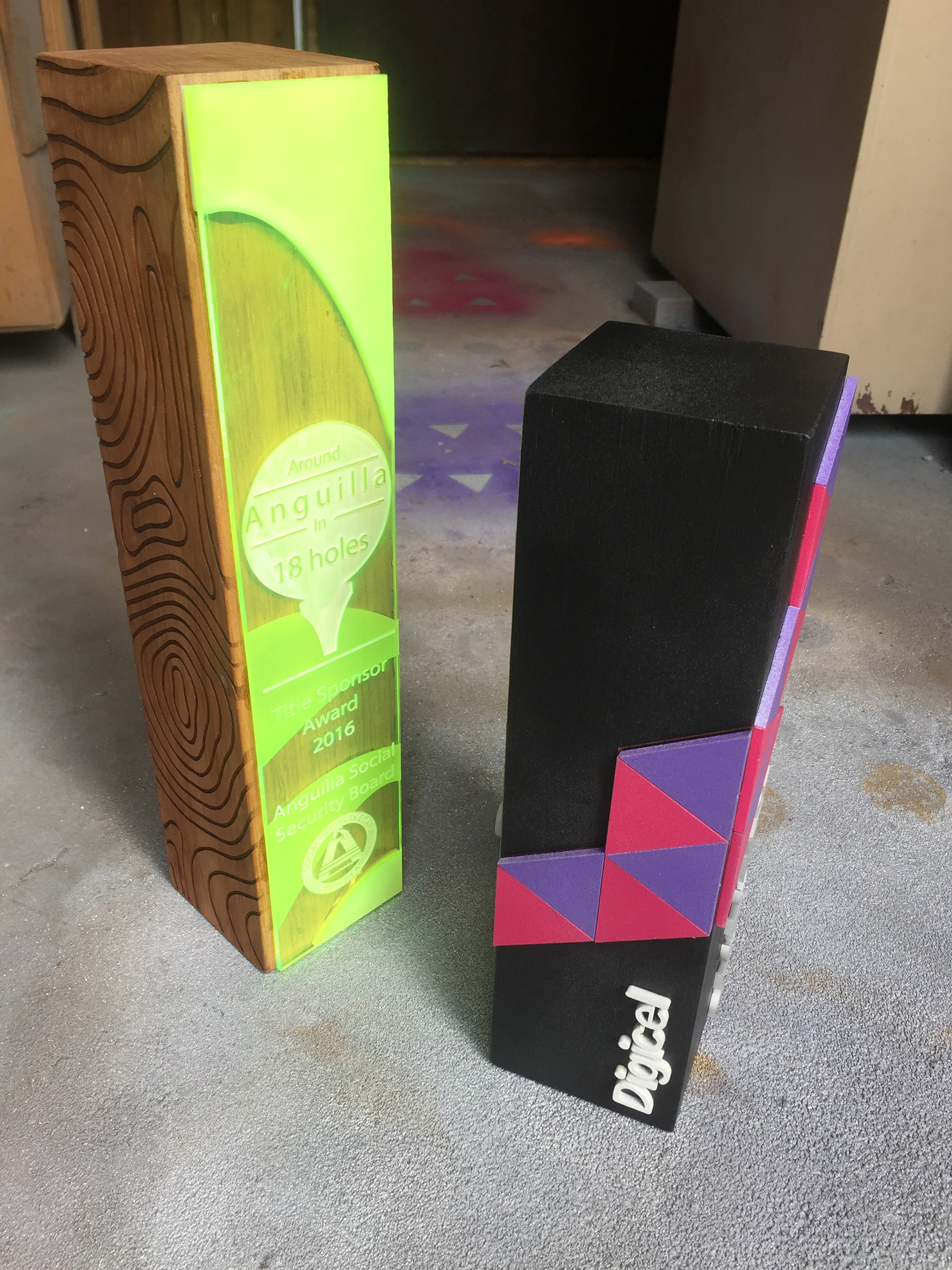 This award isĀ made with Authentic Anguilla Limestone, black aluminium screws, black acrylic, blueĀ mirrored acrylic, pink mirrored acrylicĀ and engraved and painted details.