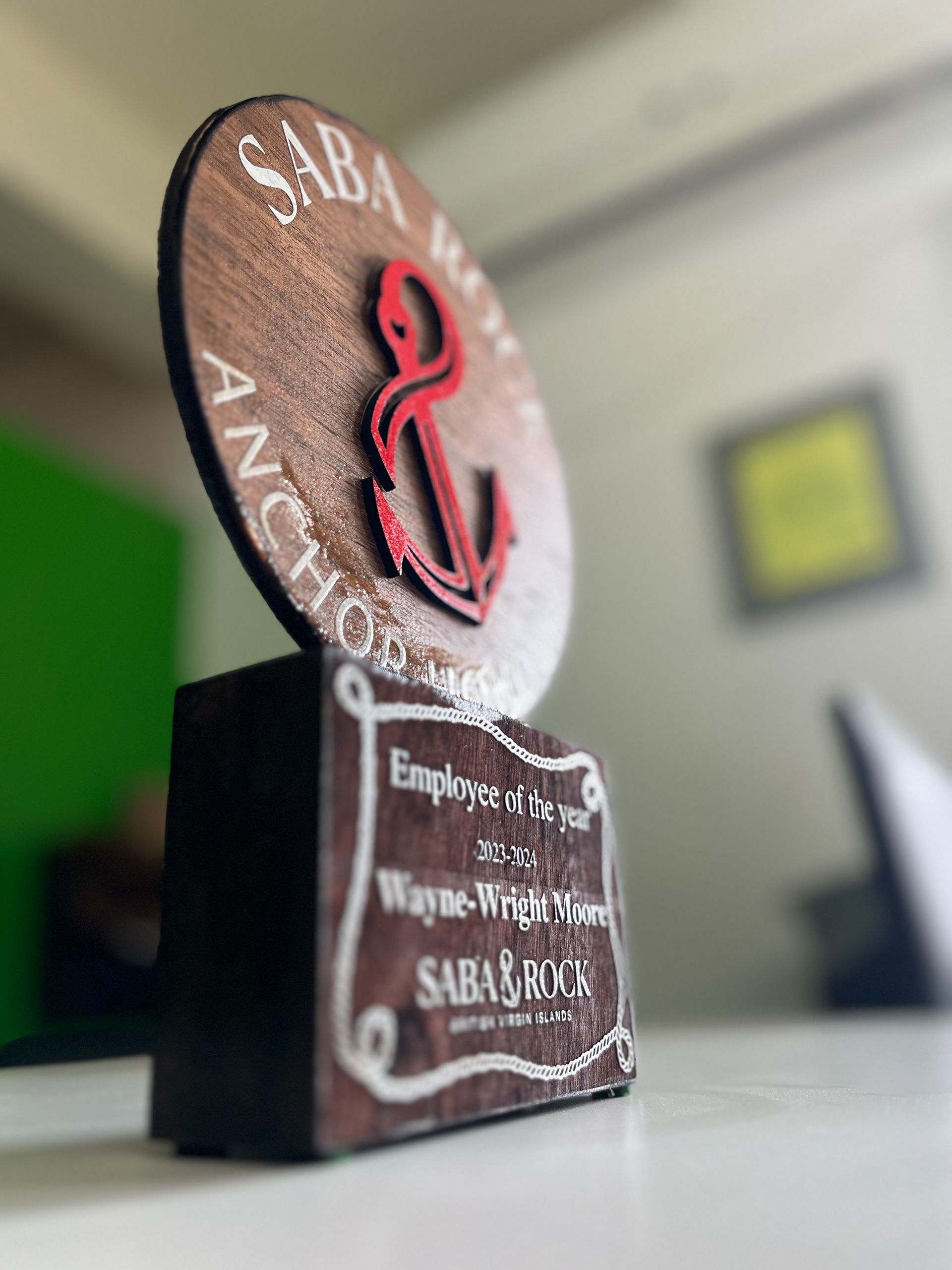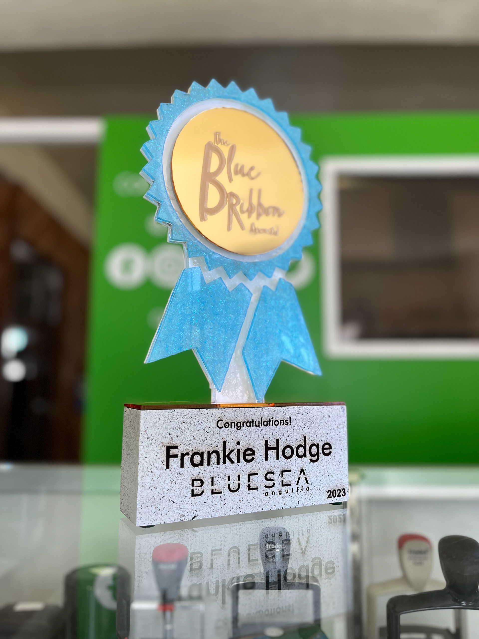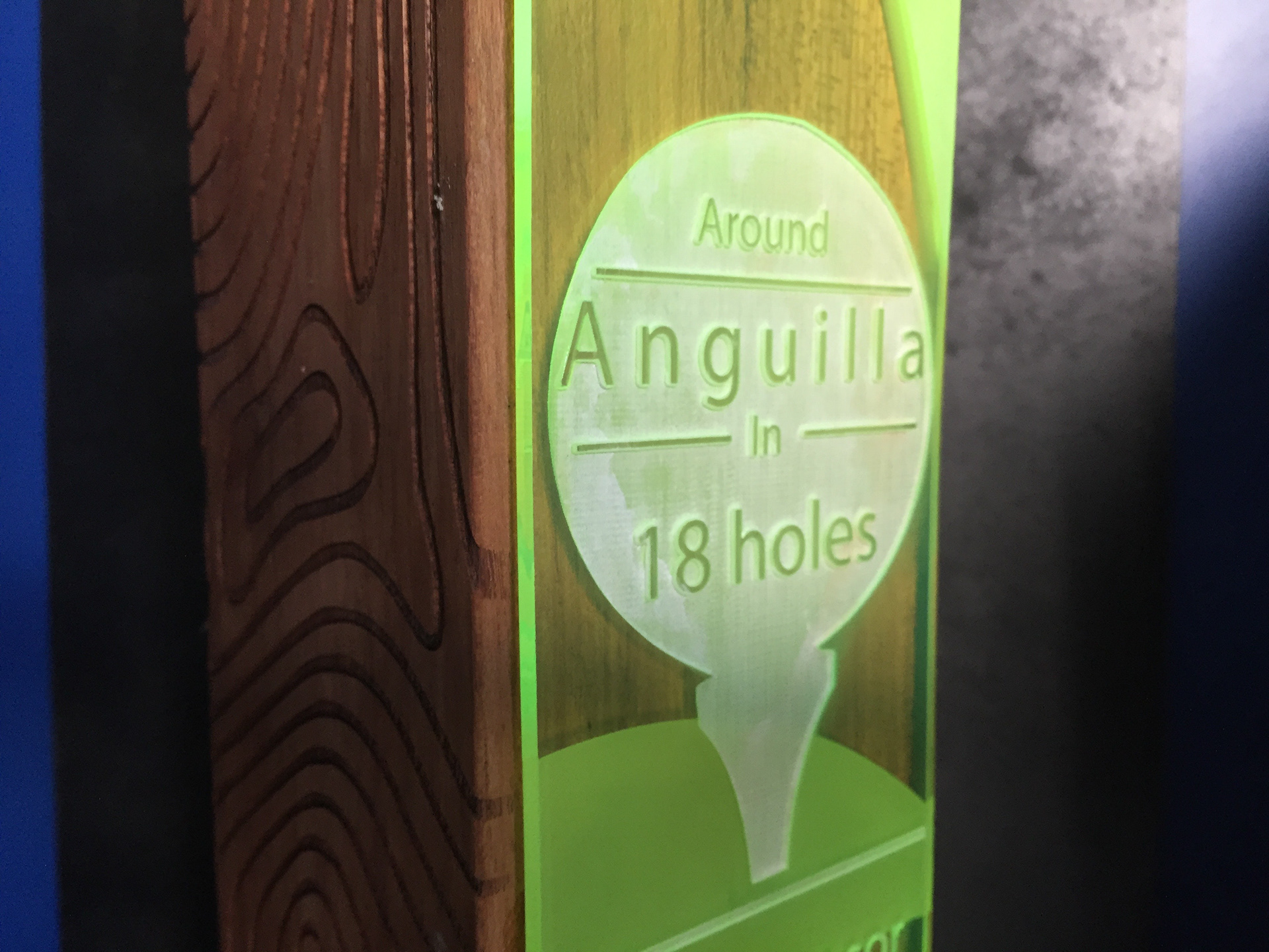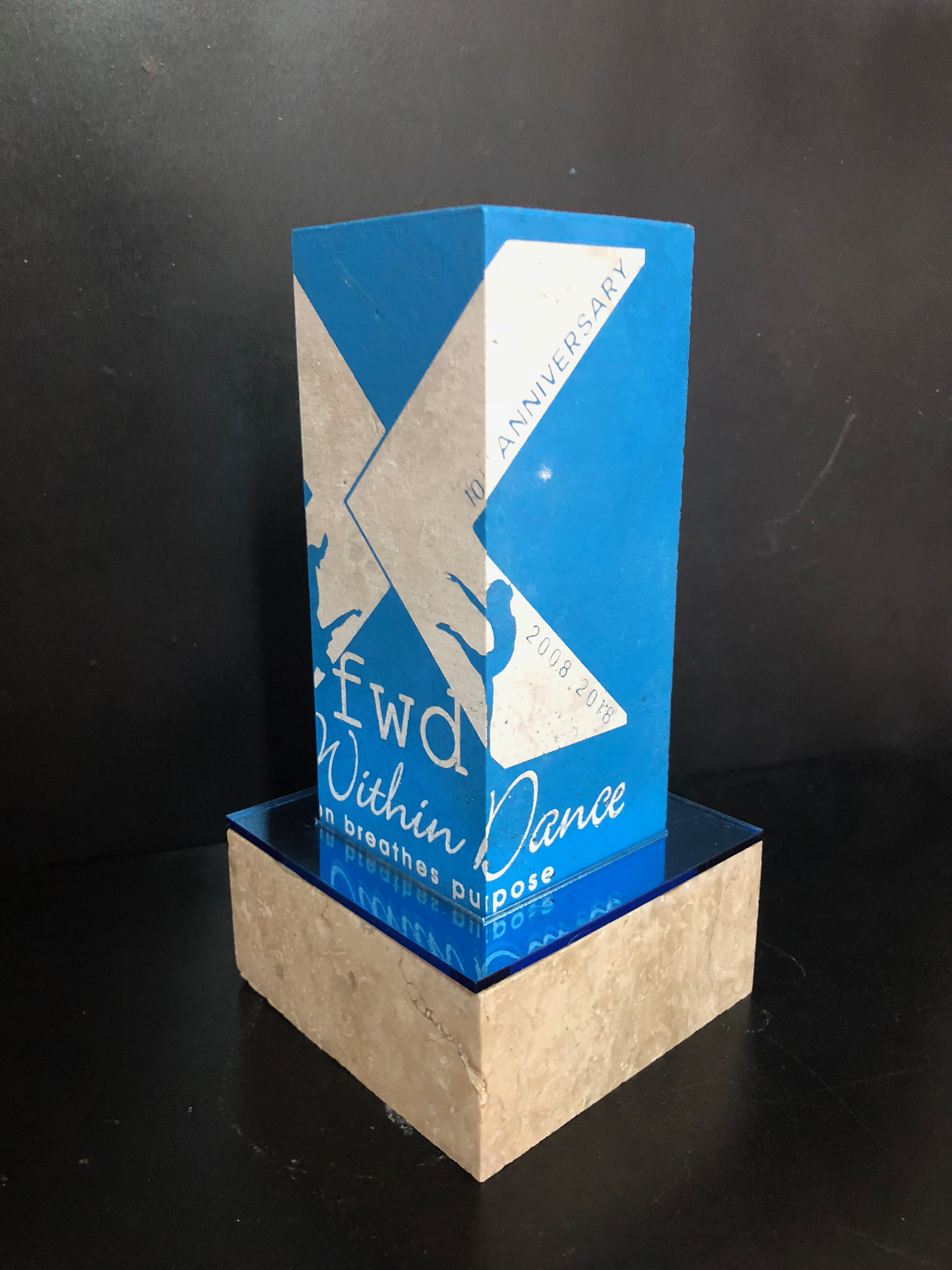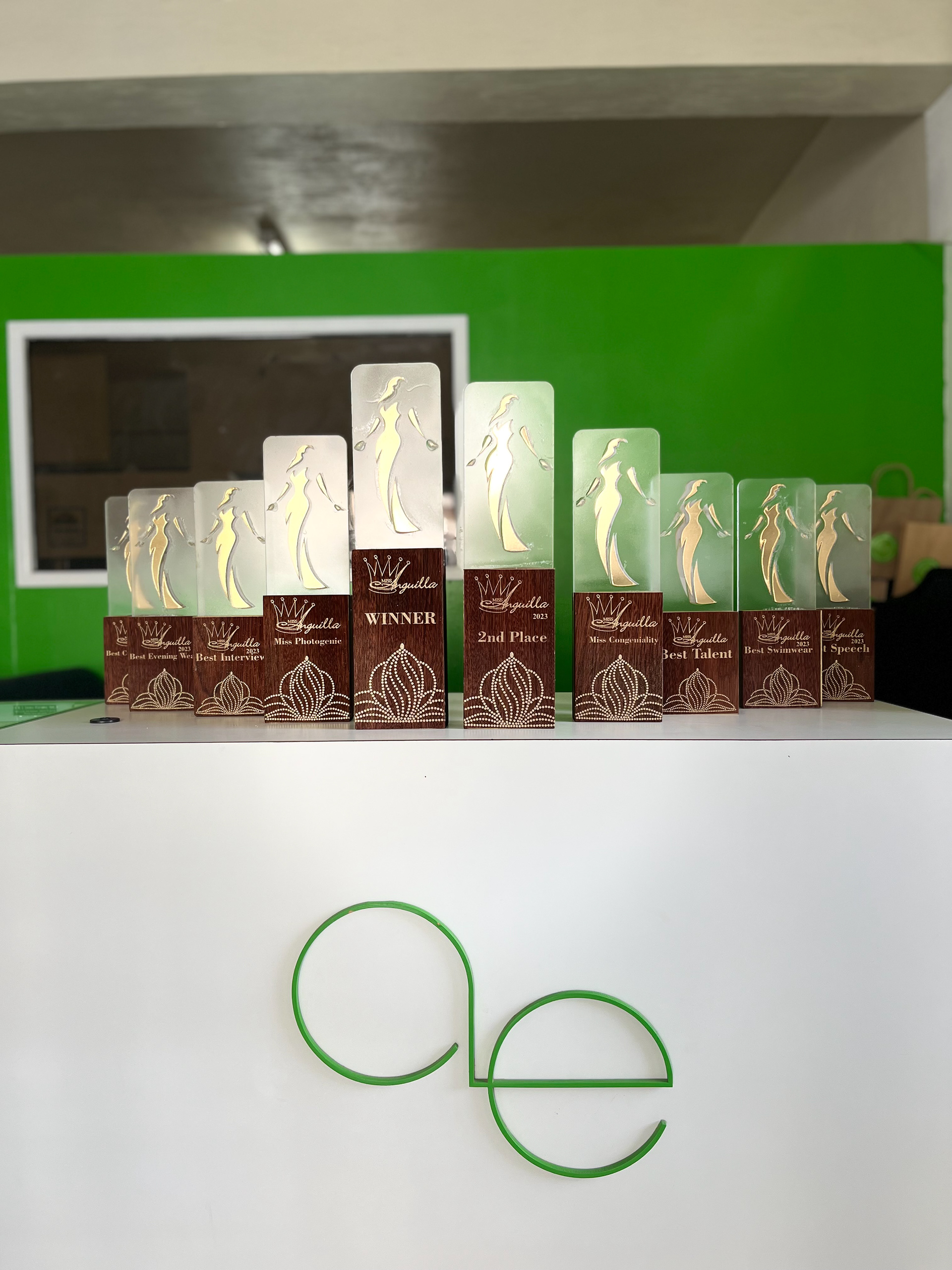 This award isĀ made with Authentic Anguilla Limestone, black aluminium screws, black acrylic, blueĀ mirrored acrylic, pink mirrored acrylicĀ and engraved and painted details.