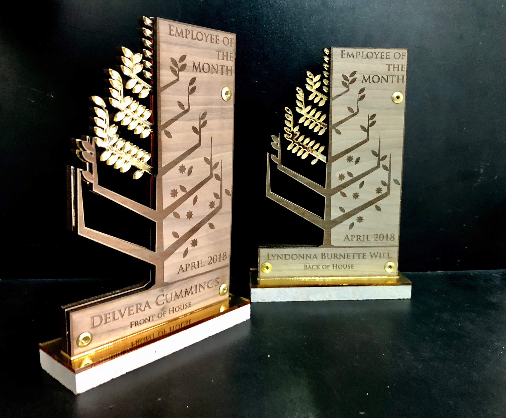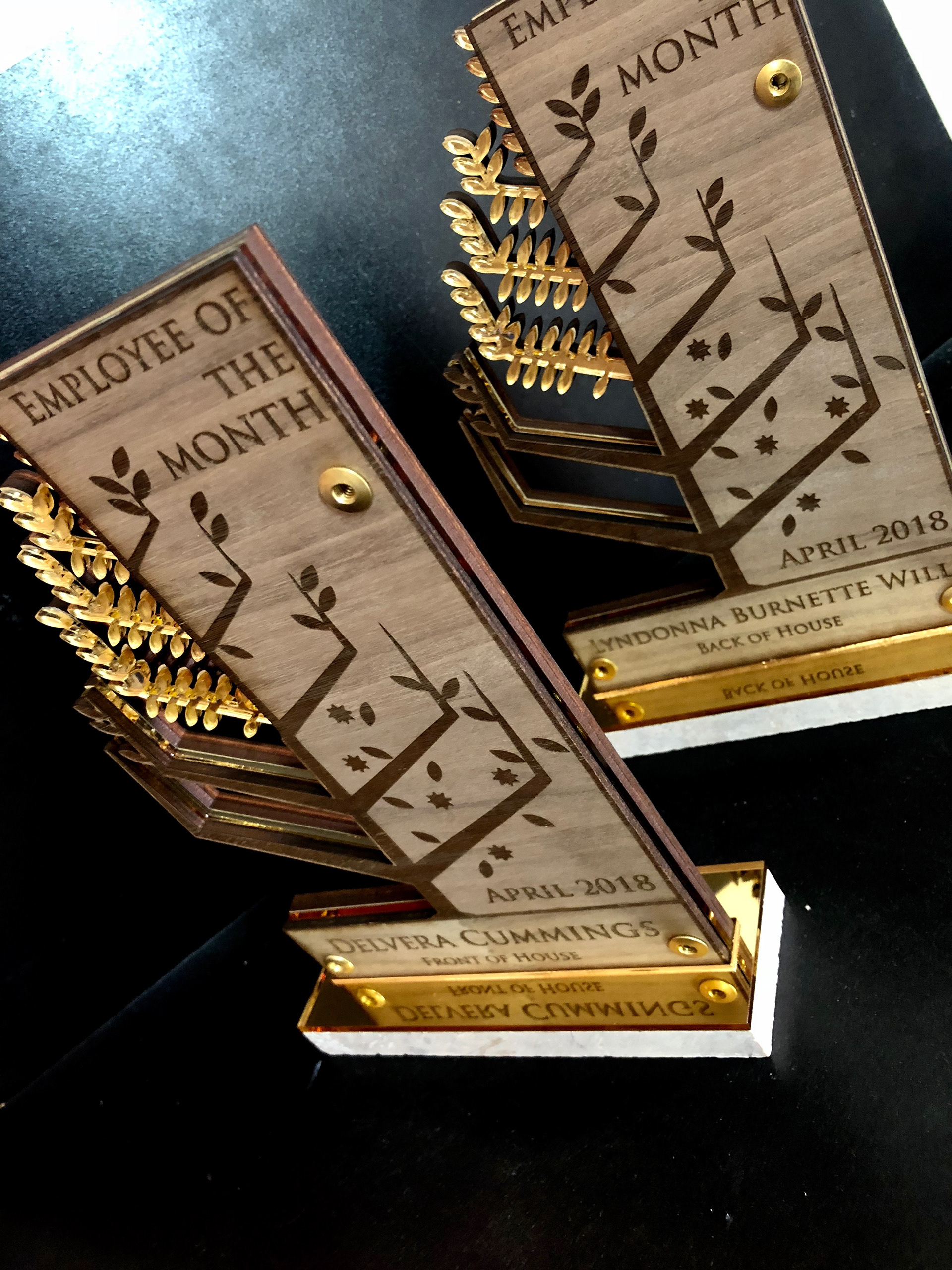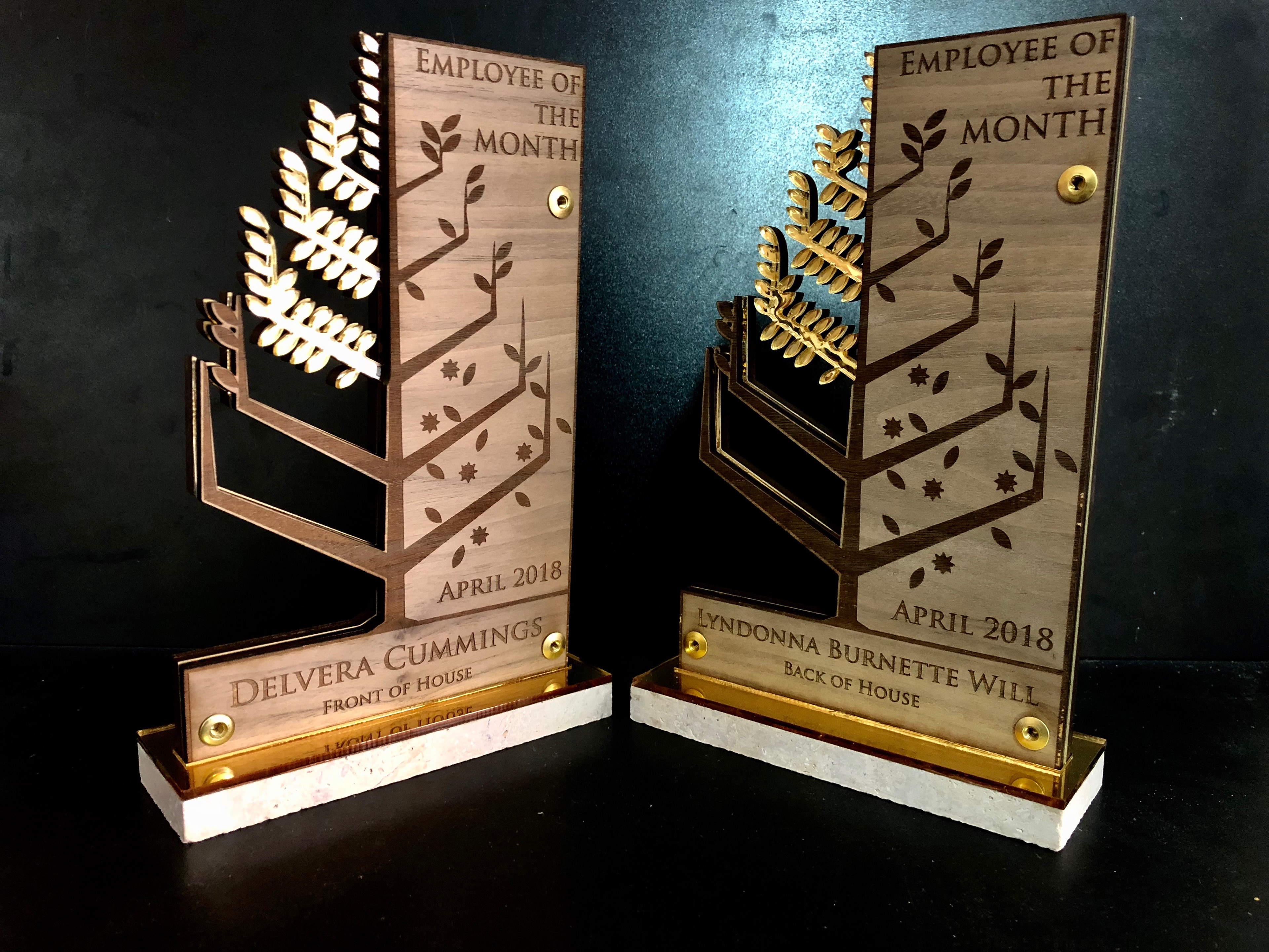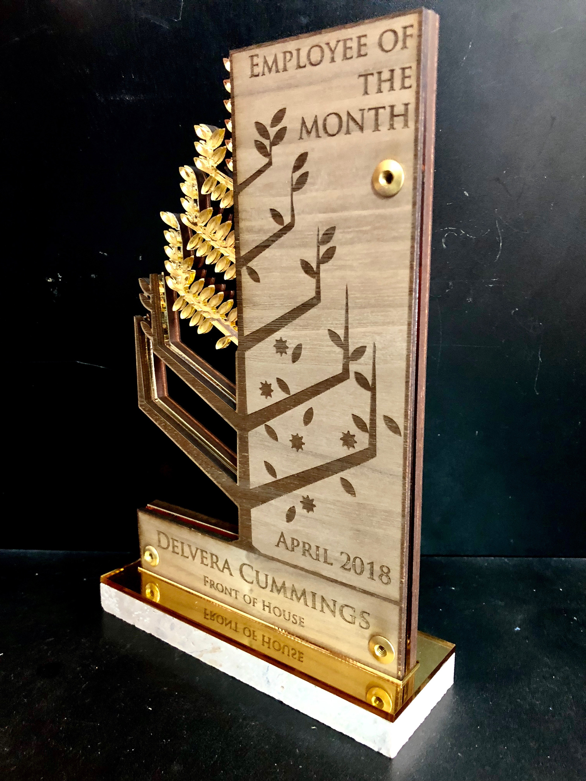 These Awards are made with Walnut, gold mirrored acrylic, gold standoffs and laser engraved details and text.