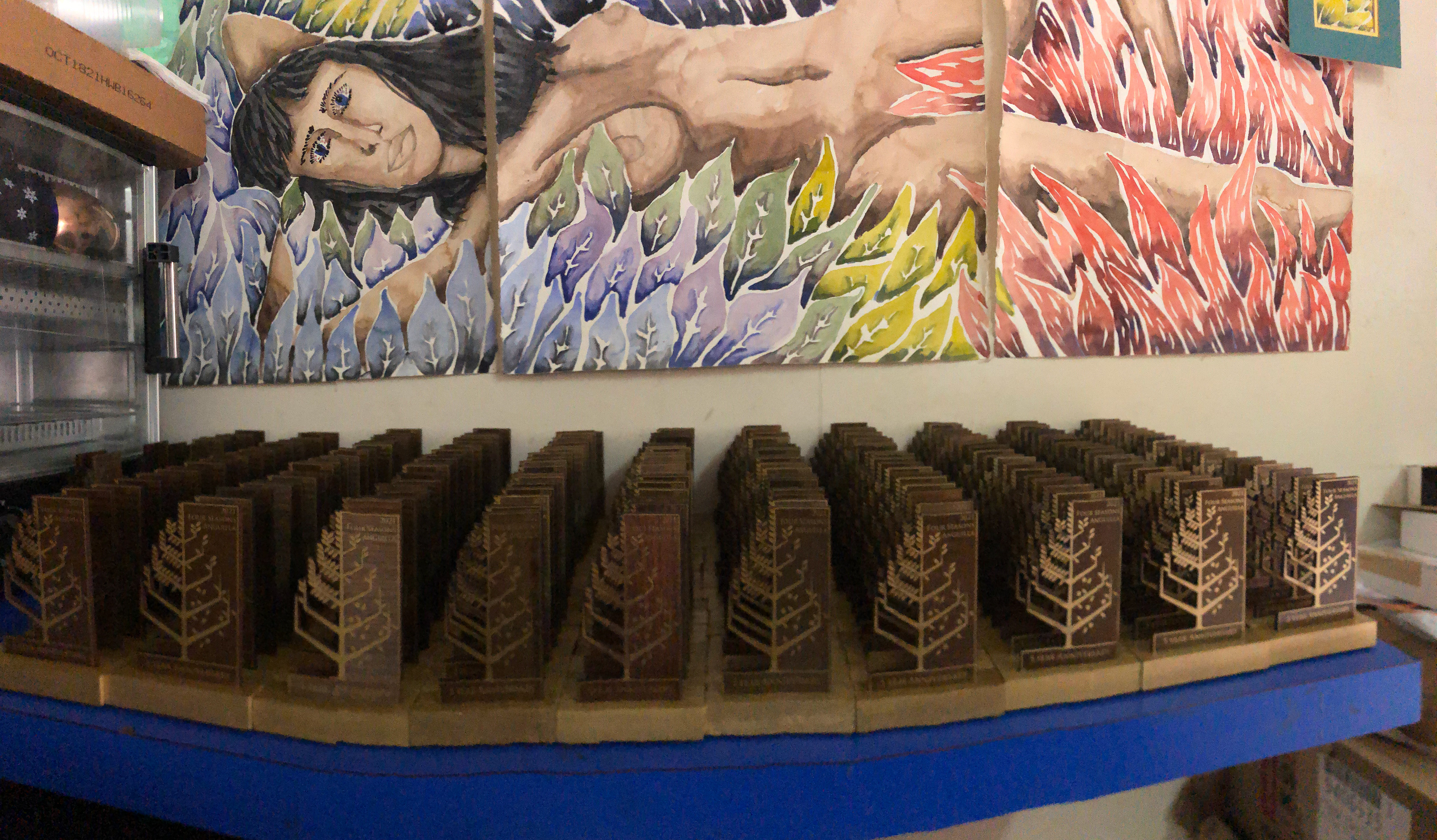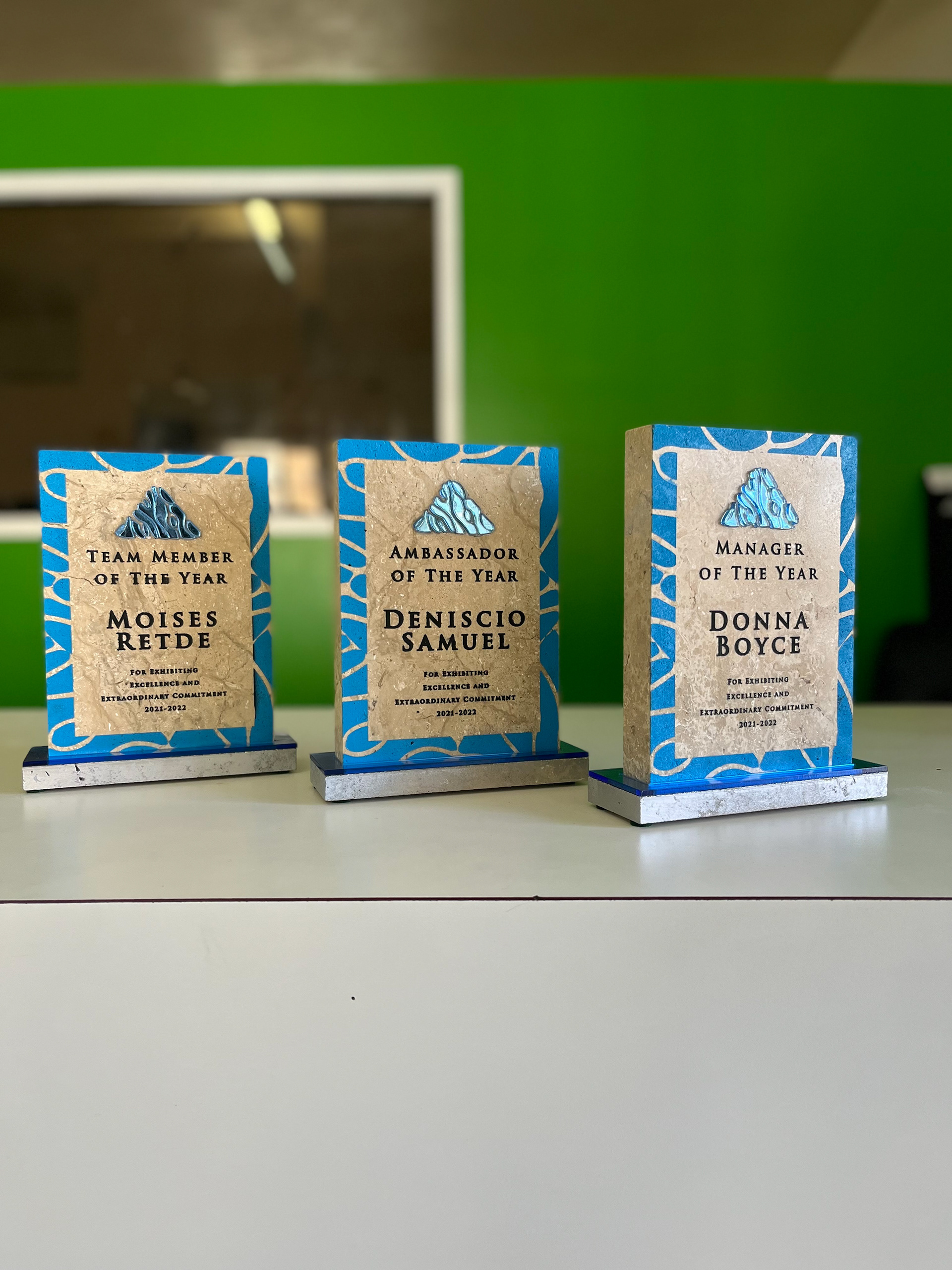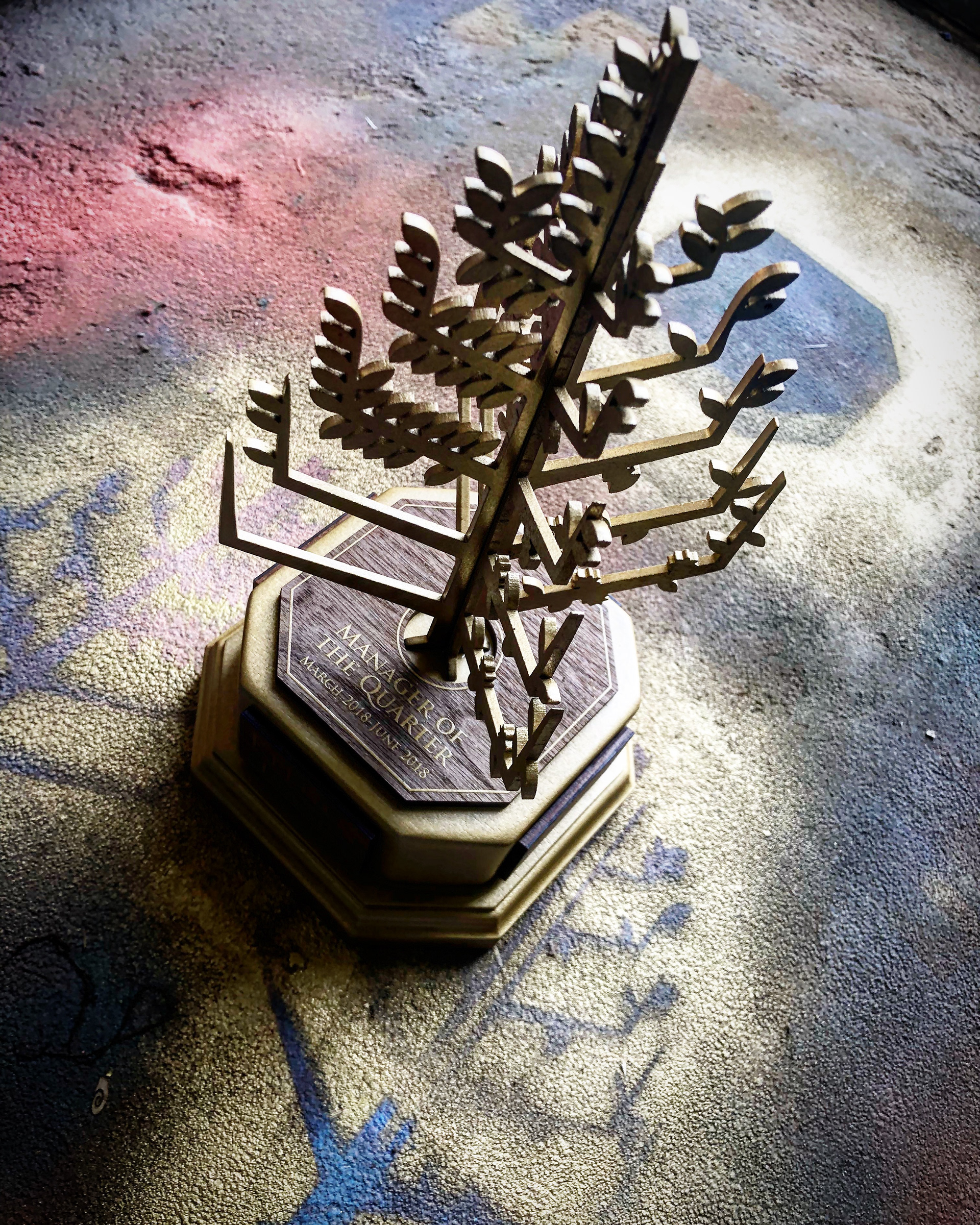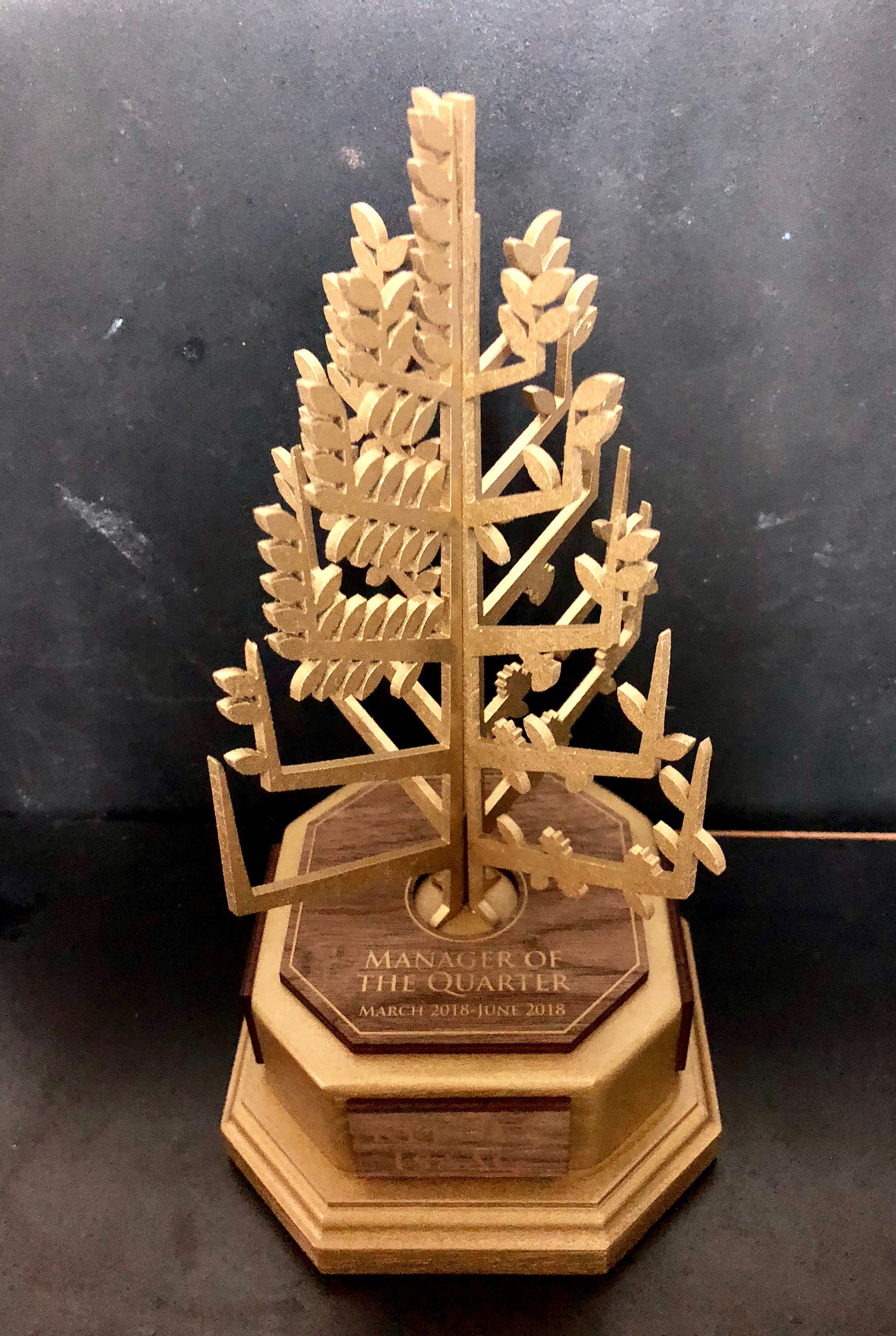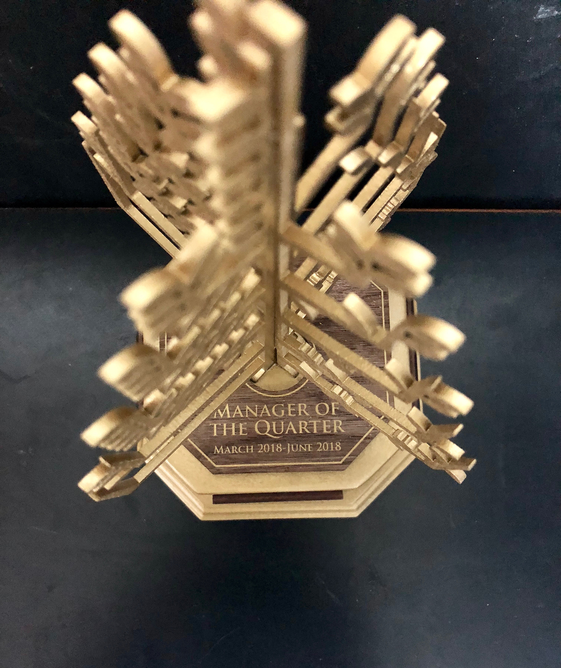 These Awards are made with Walnut, gold mirrored acrylic, gold standoffs and laser engraved details and text.