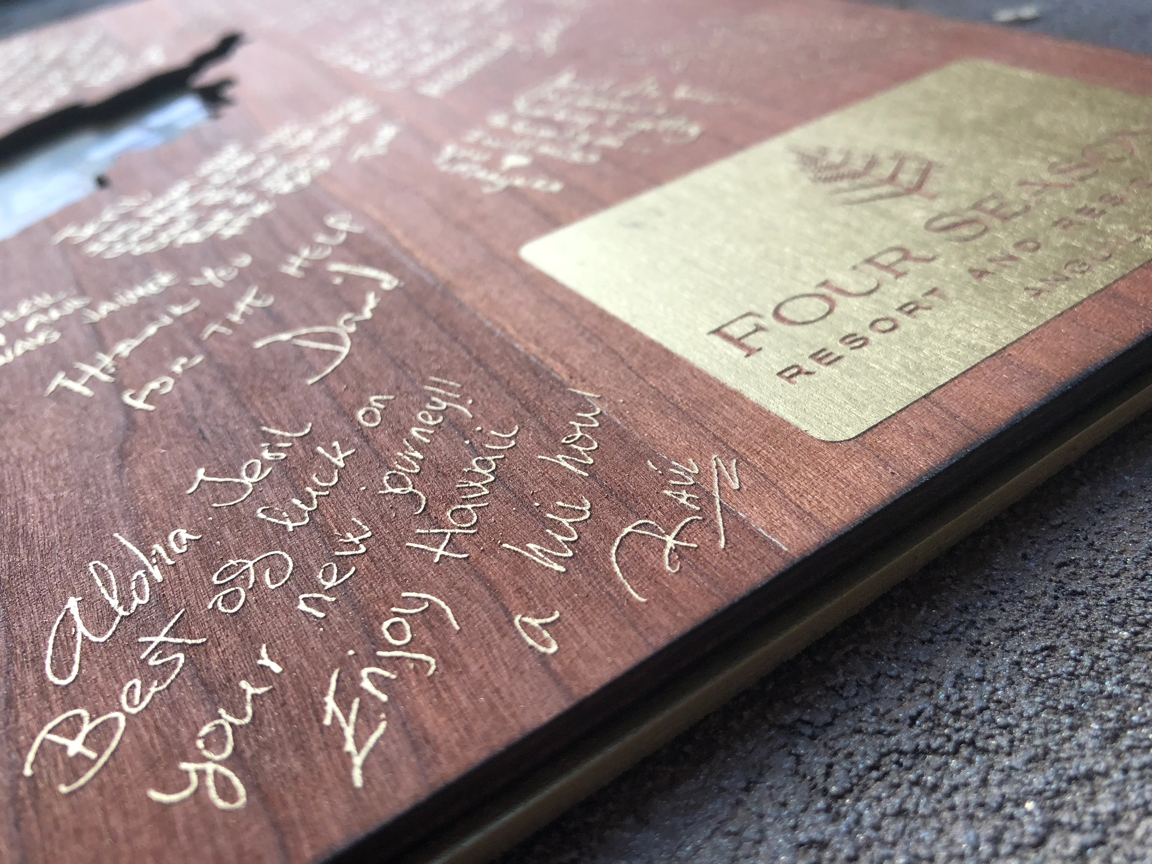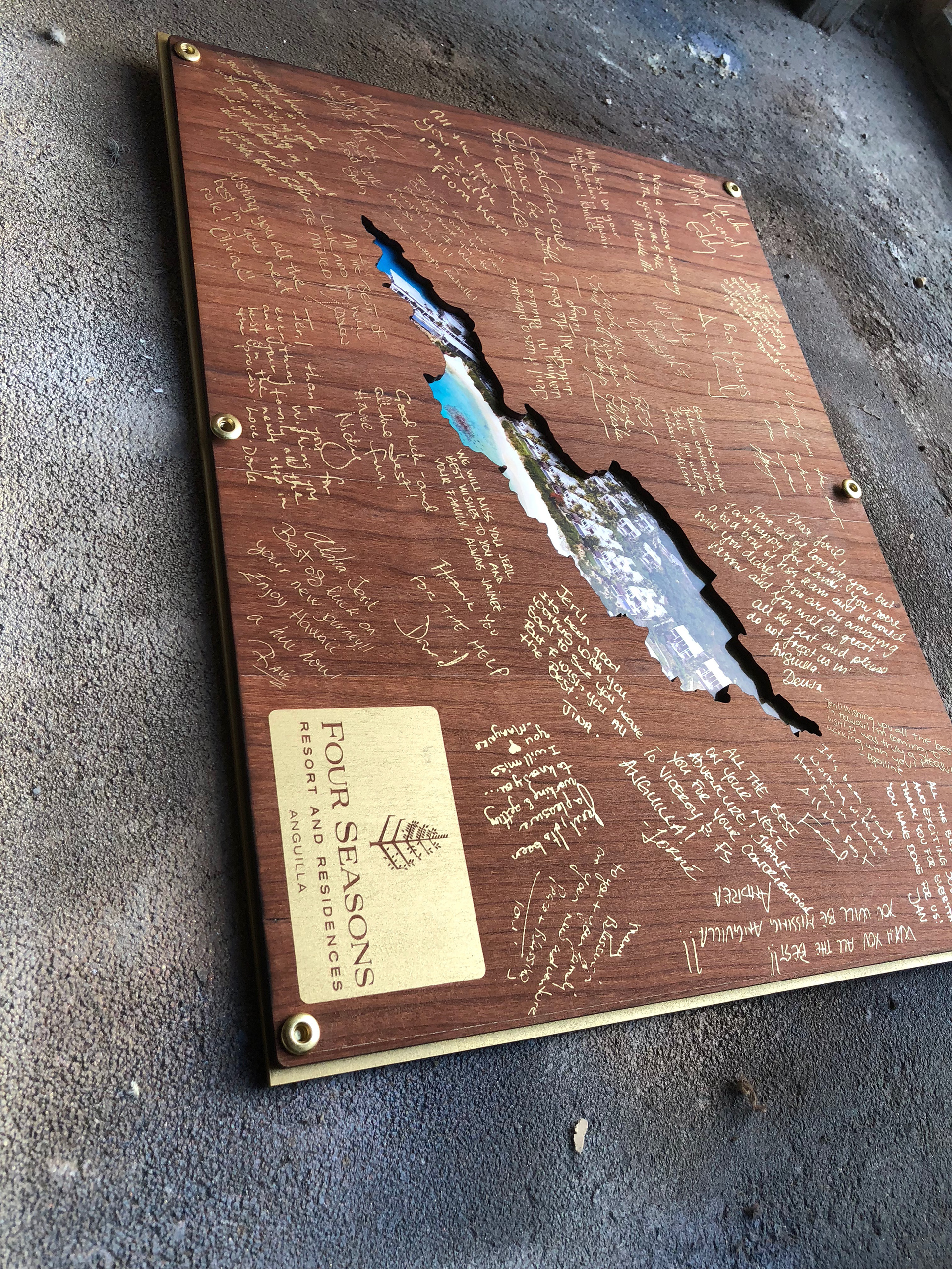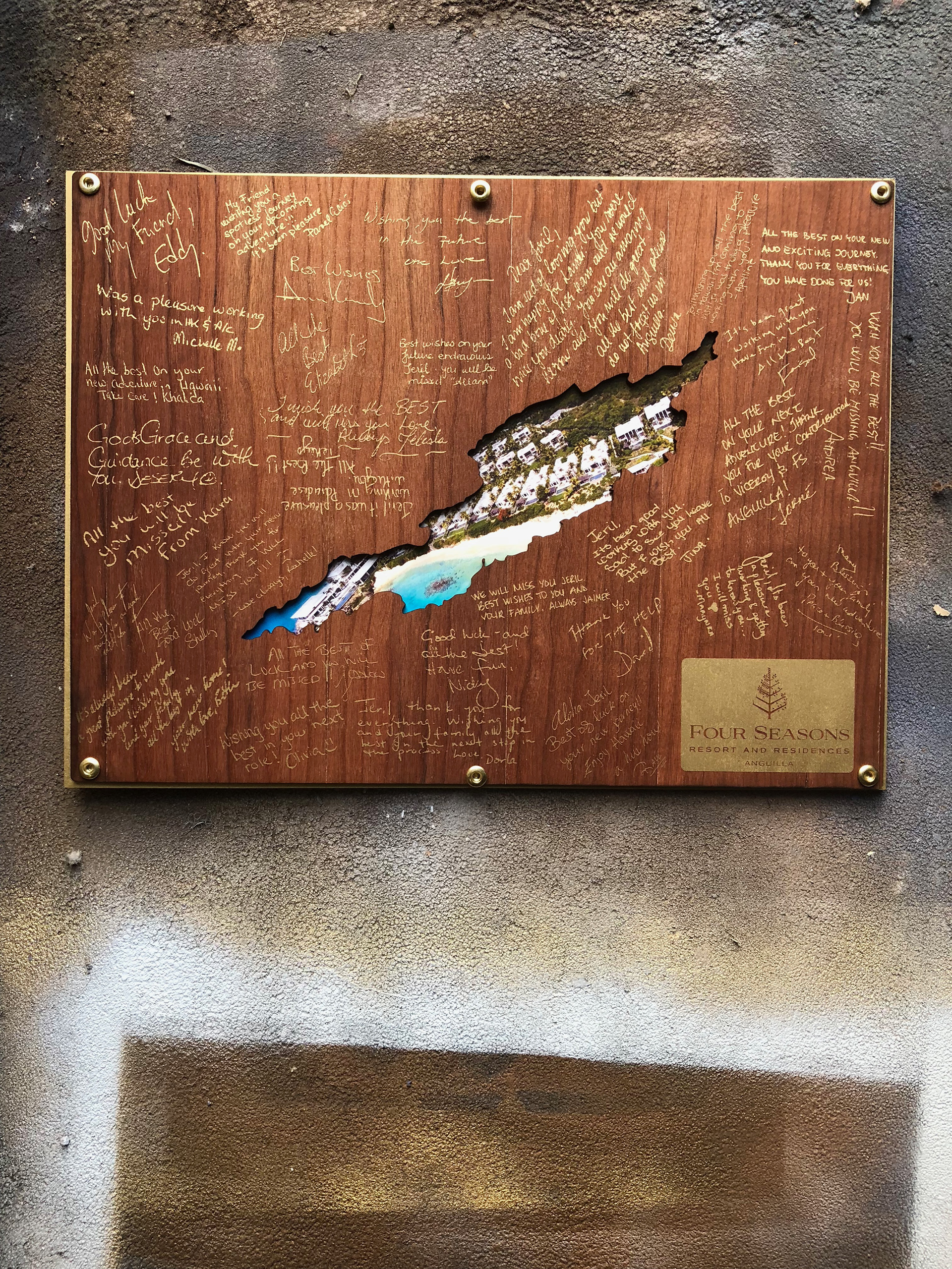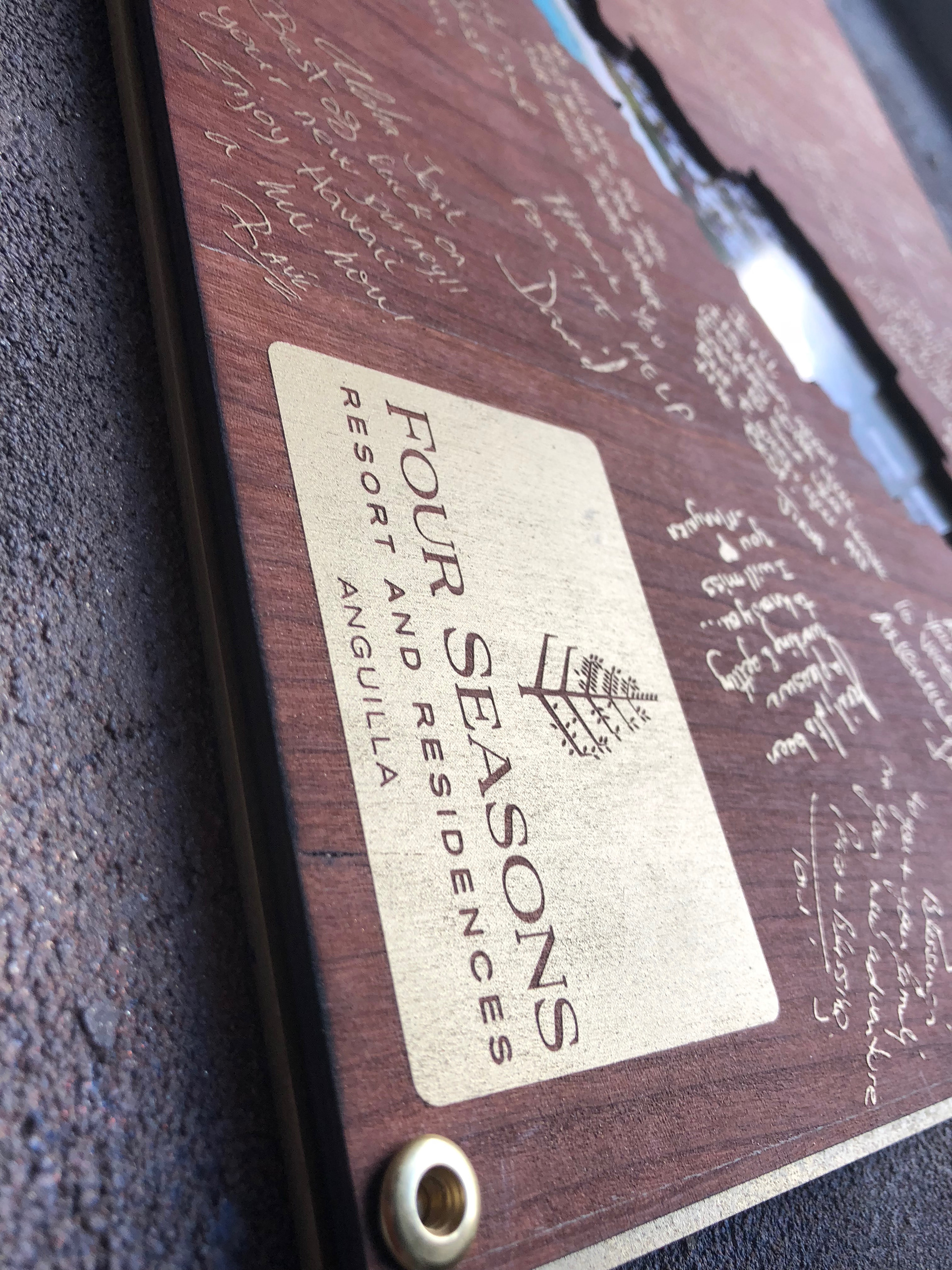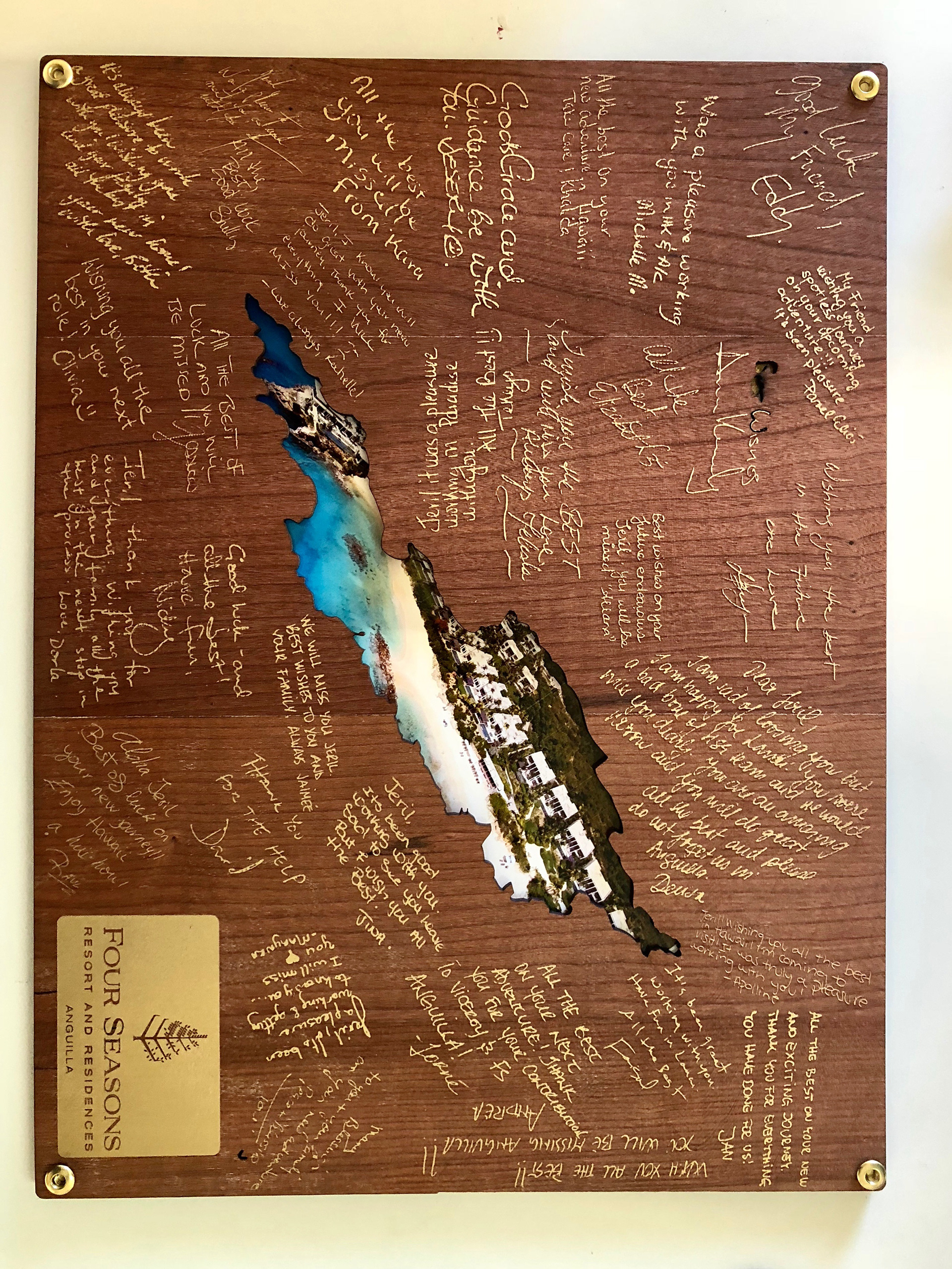 The Four Seasons Resort & Residences Anguilla Transferring Manager Custom Photo Frame with etched signatures and notes.