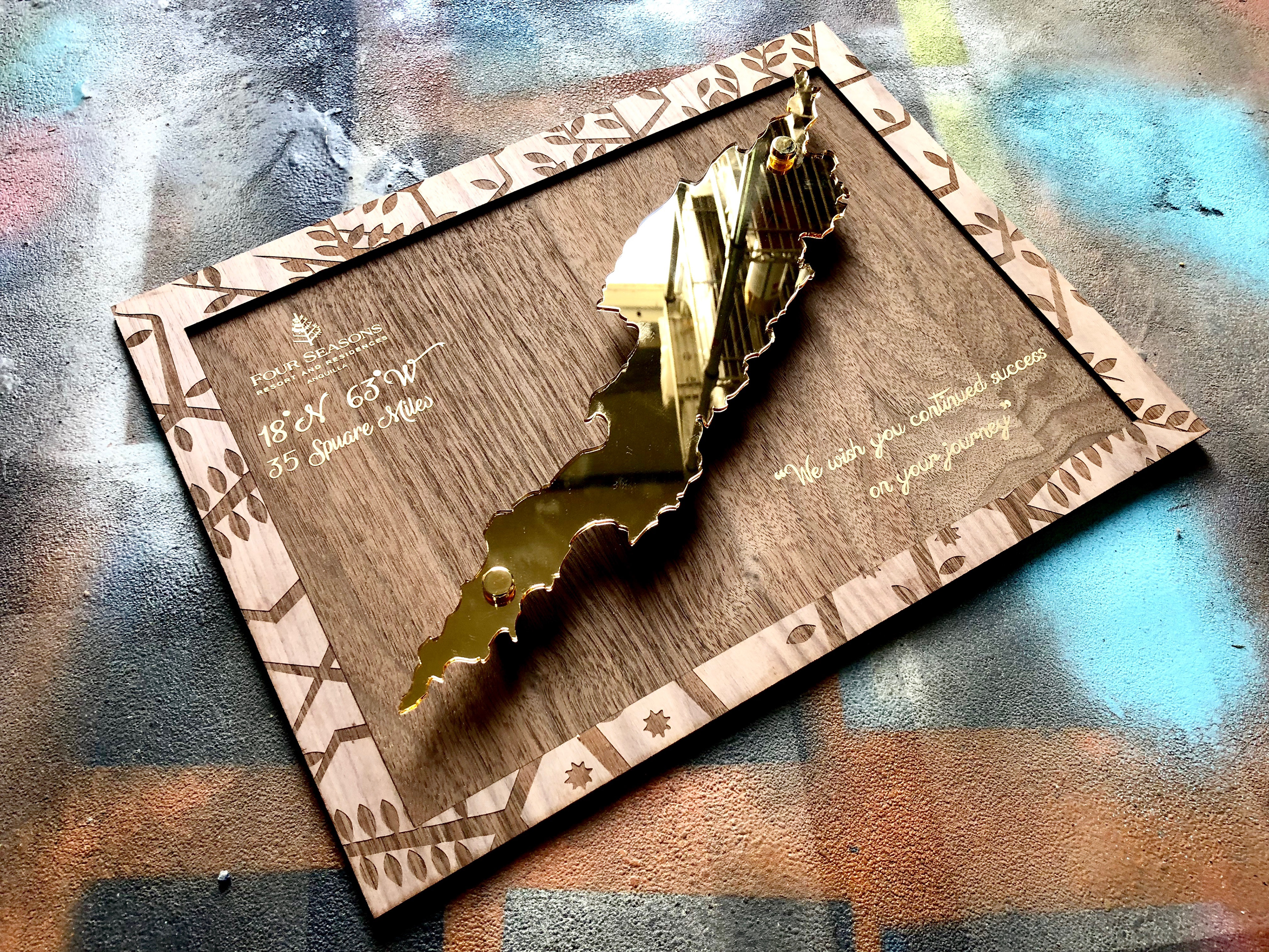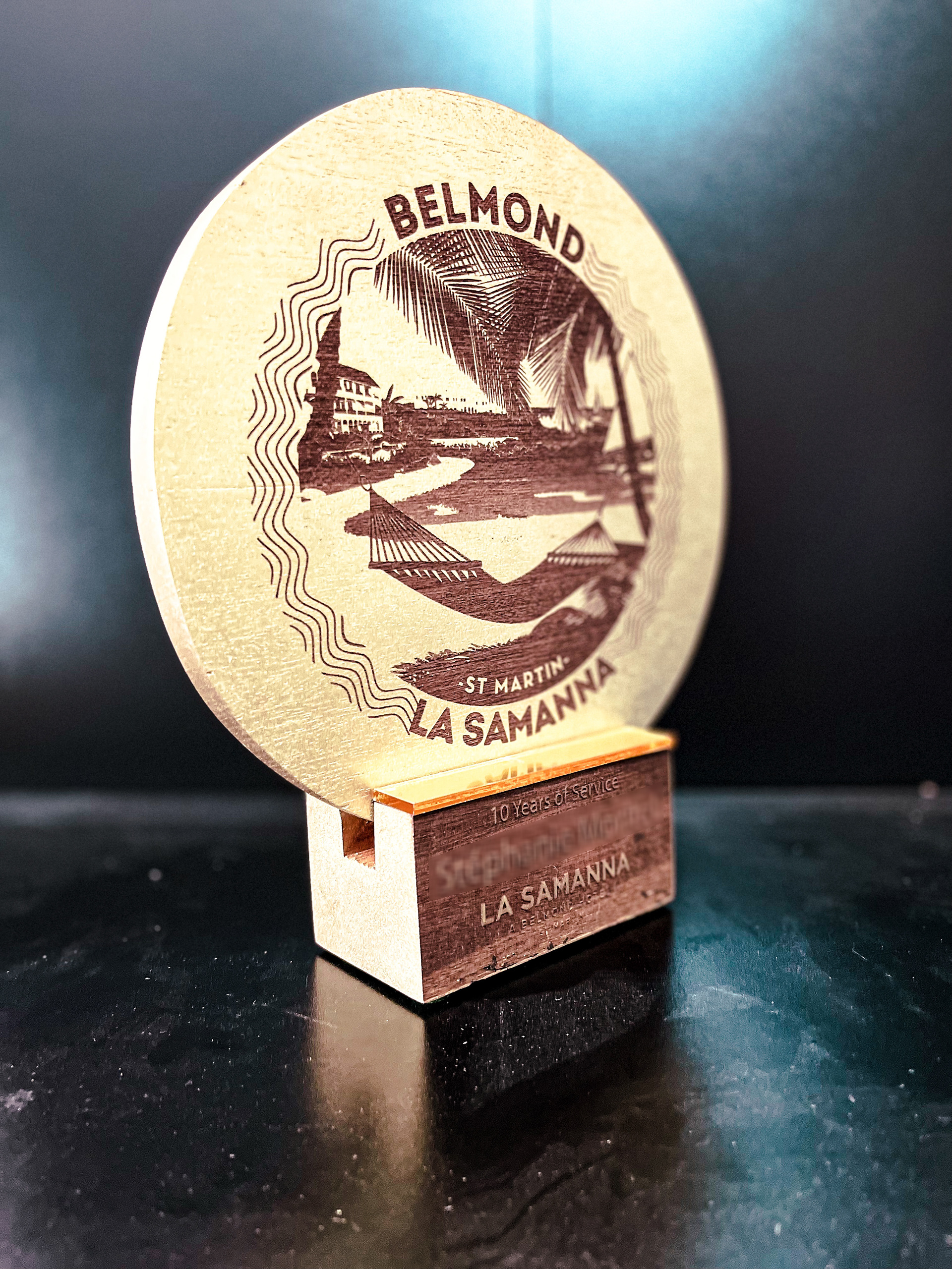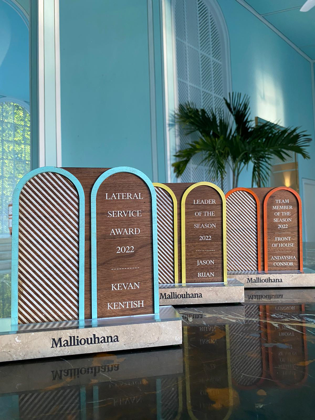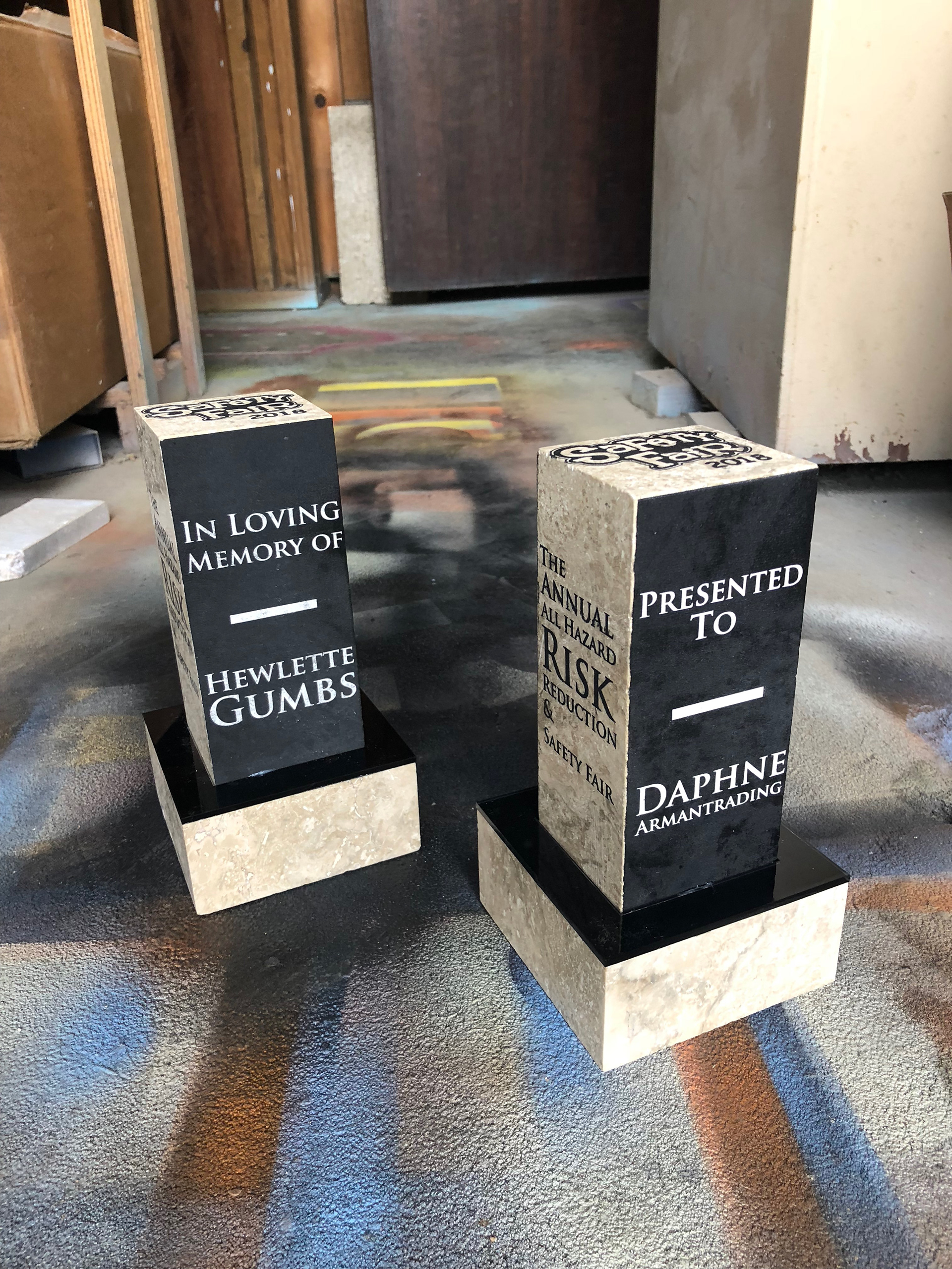 These Awards are made with Walnut, gold mirrored acrylic, authentic anguilla limestone, brass screws and laser engraved details and text.