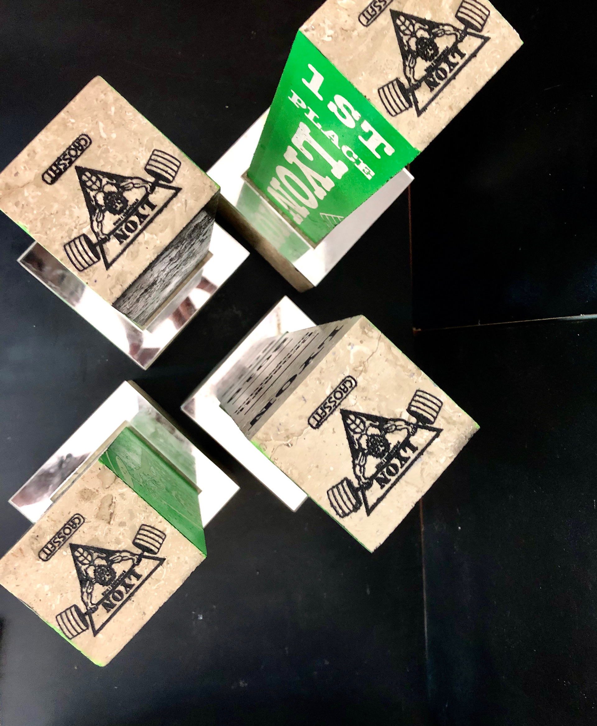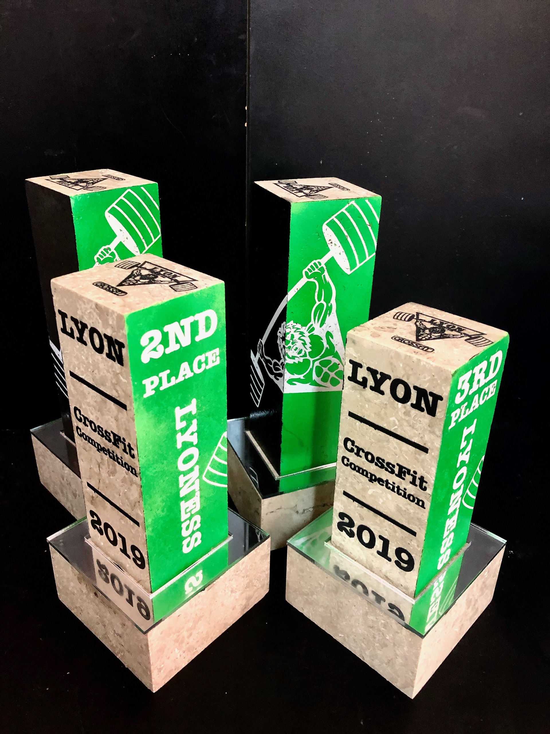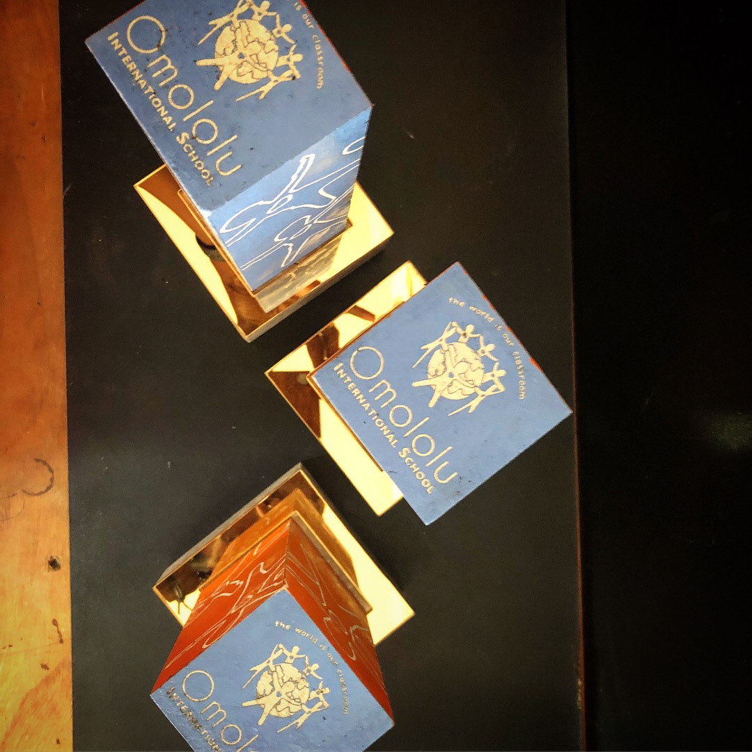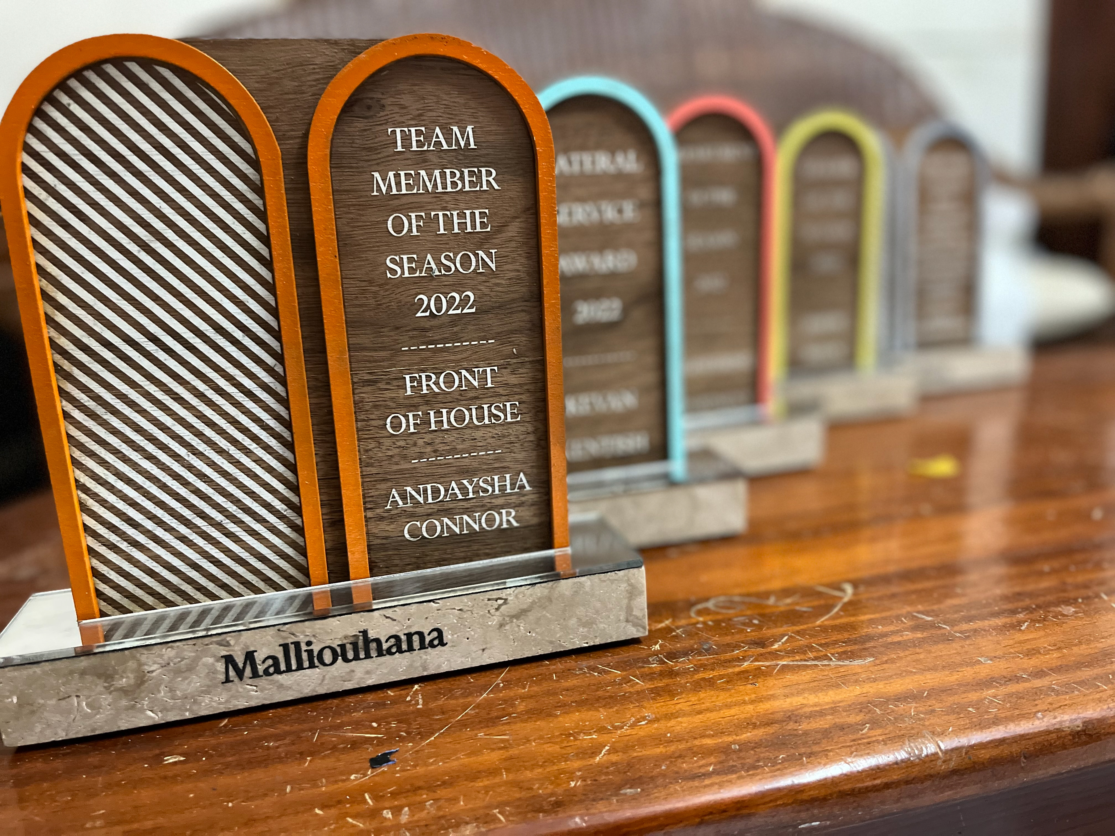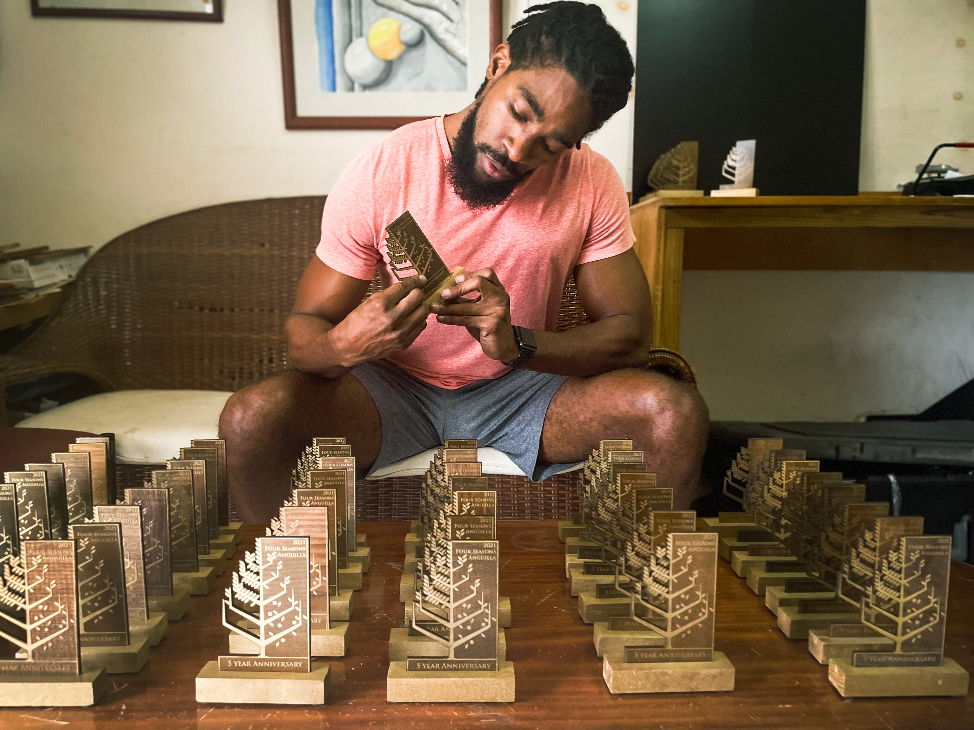 These Awards are made with Walnut, gold mirrored acrylic, authentic anguilla limestone, brass screws and laser engraved details and text.