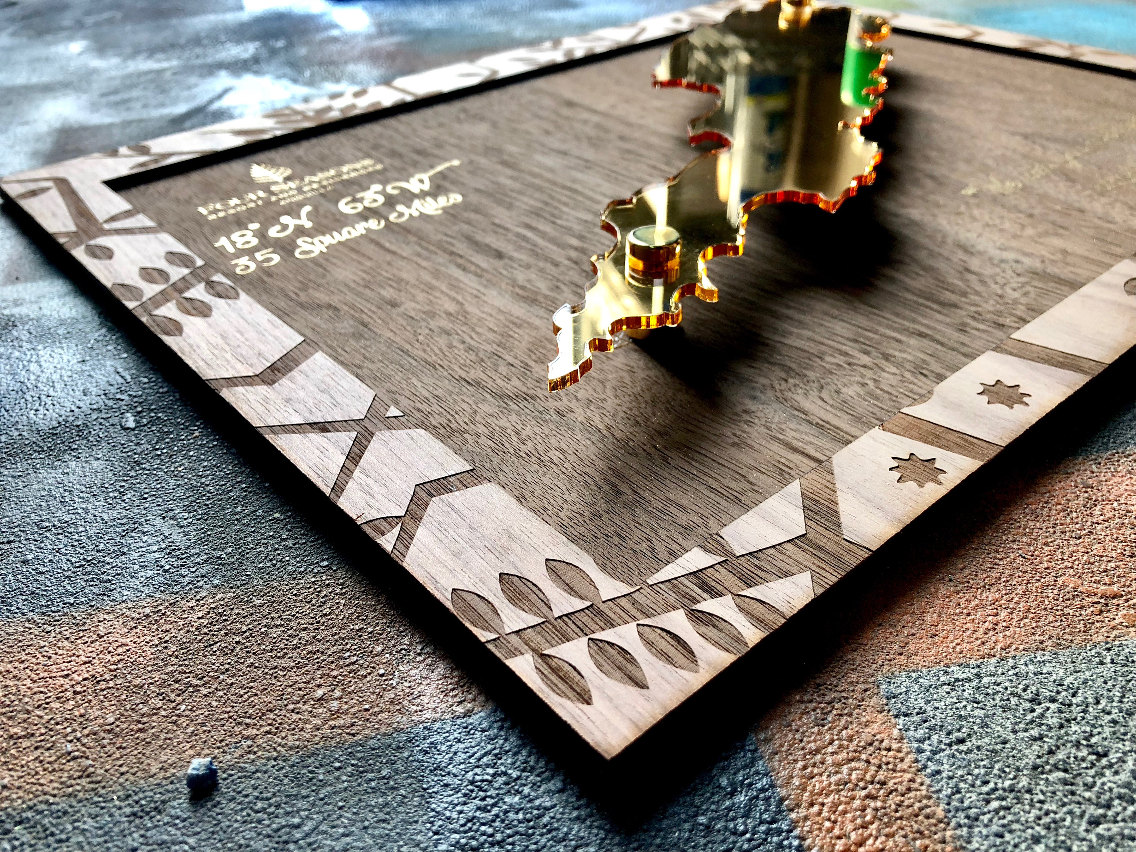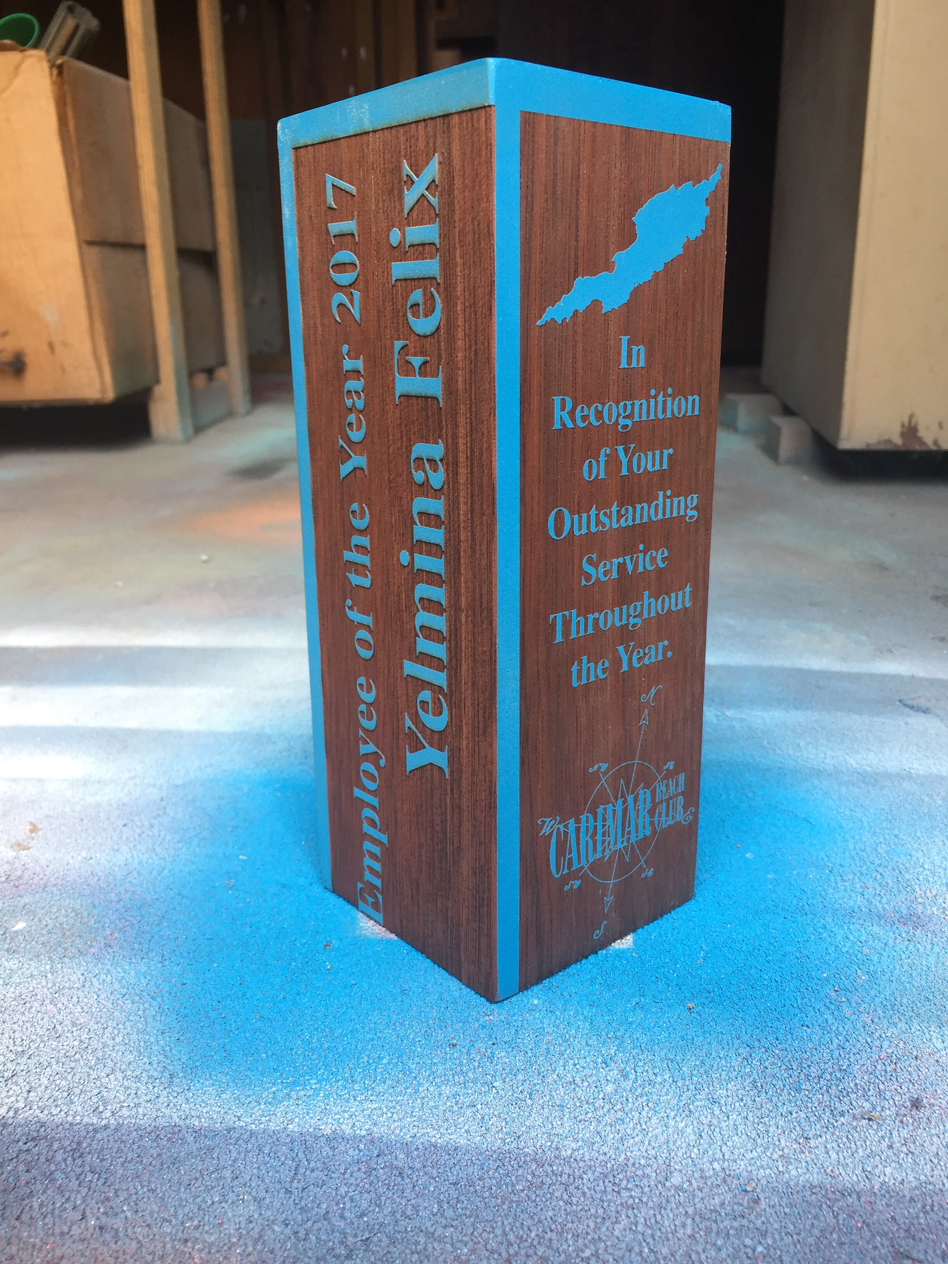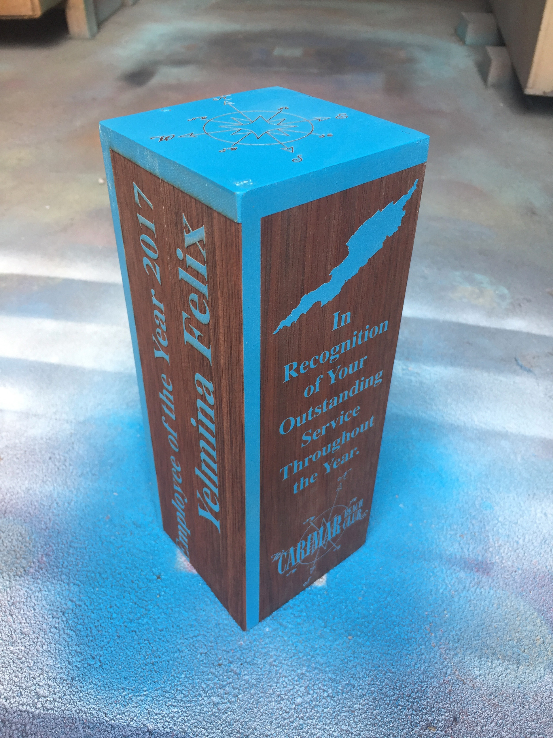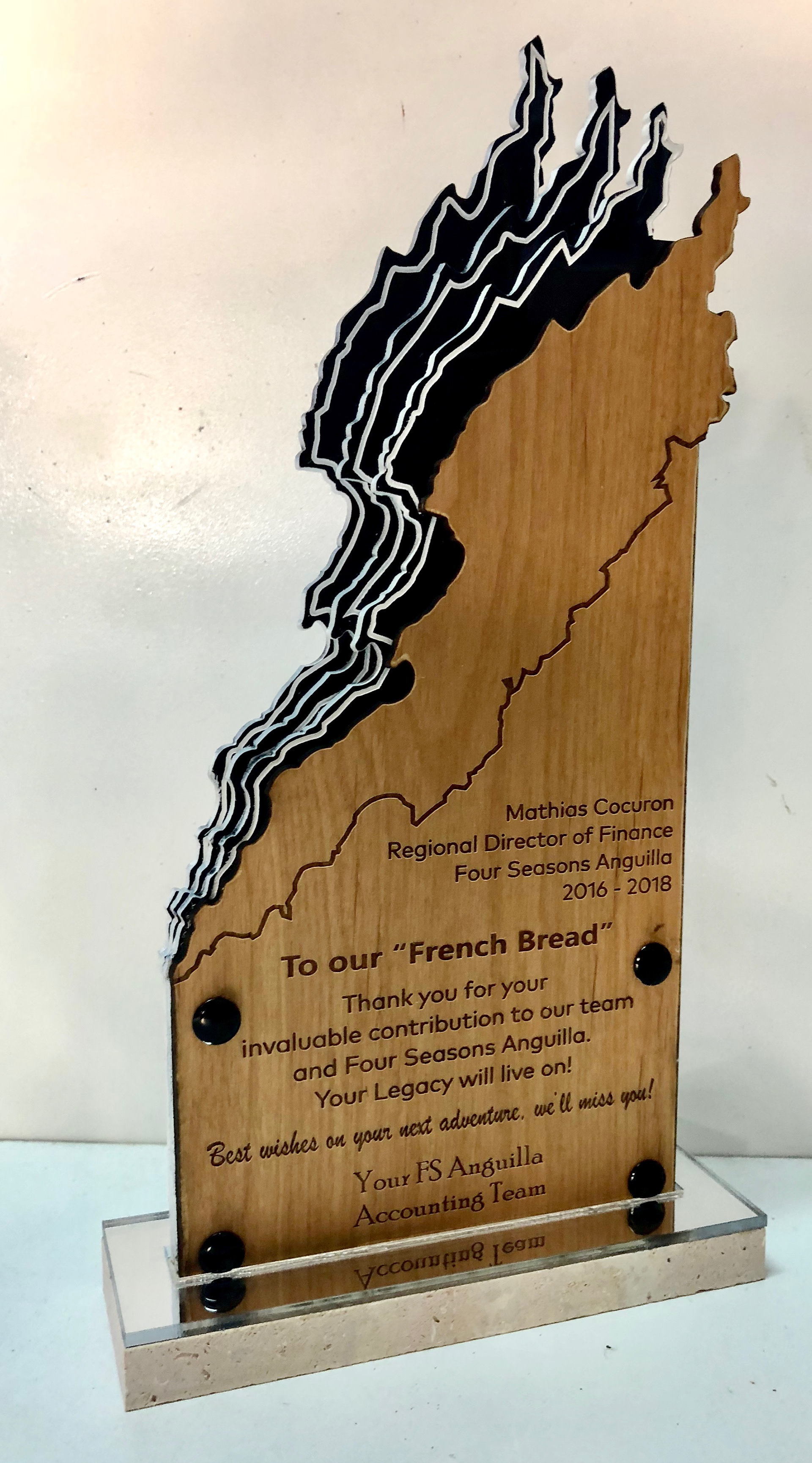 This award isĀ made with Authentic Anguilla Limestone, brass screws, black acrylic, goldĀ mirrored acrylic clear acrylic, and engraved and painted details.