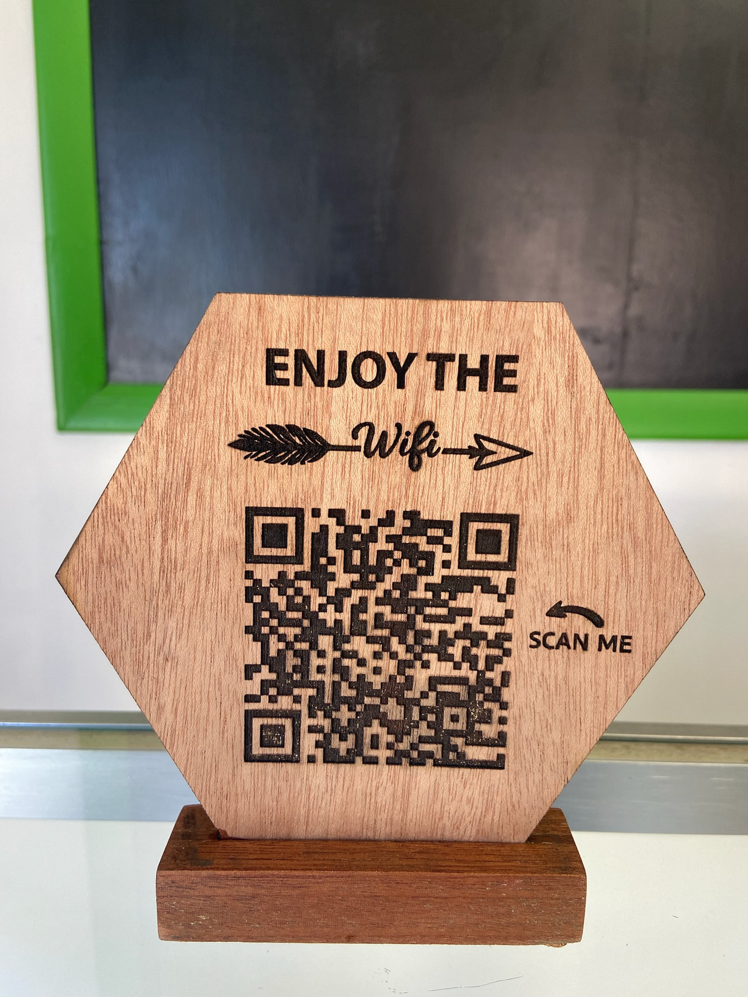 This laser cut and laser engraved Wi-Fi QR code sign was created in cherry and walnut for Black Orchid Florist and Events, blending practicality with warm, natural materials. Designed for easy guest access, the engraved QR code allows visitors to connect seamlessly, while the handcrafted wood base adds an elevated, boutique feel that aligns beautifully with the brand’s event-focused aesthetic.