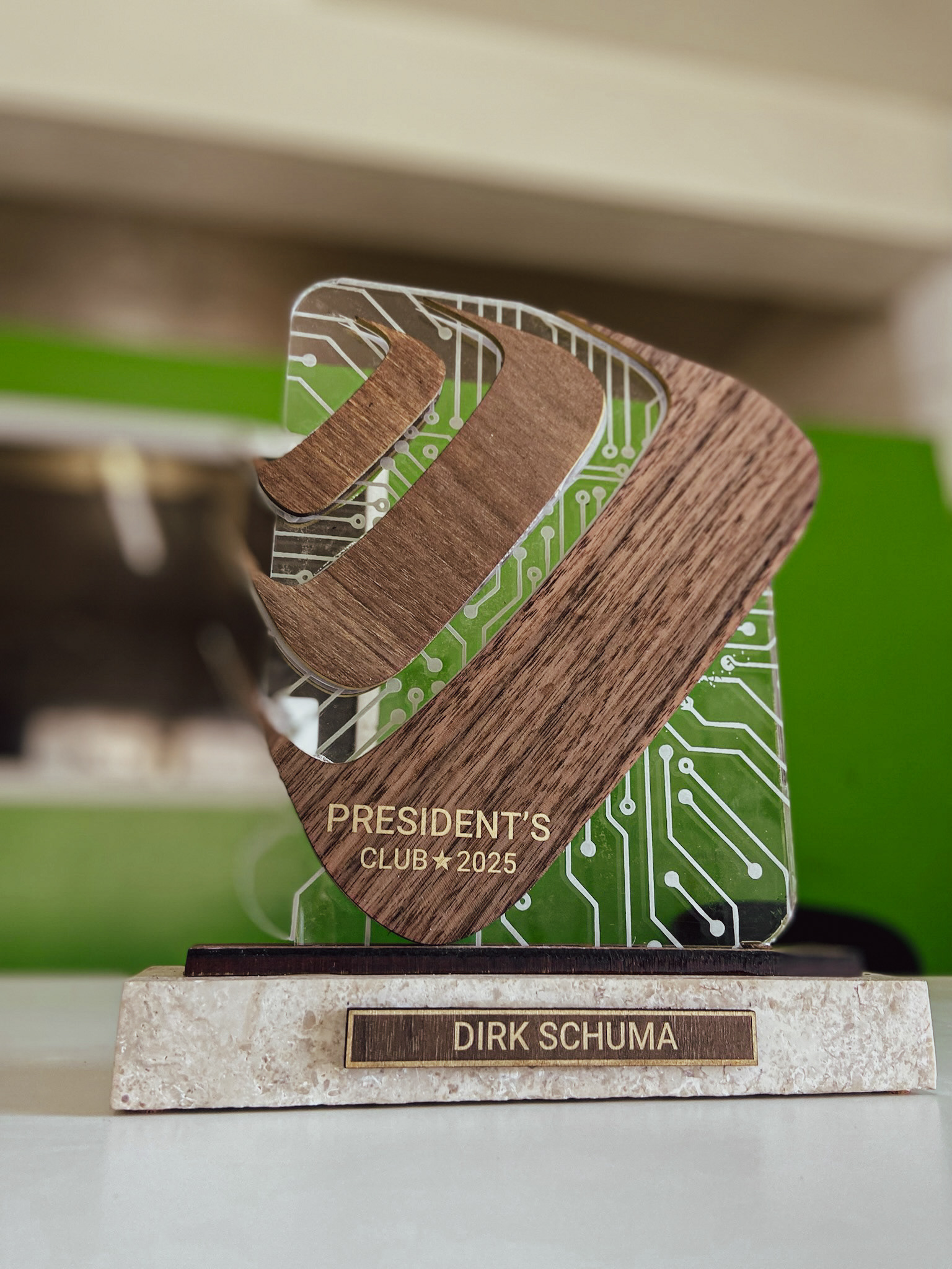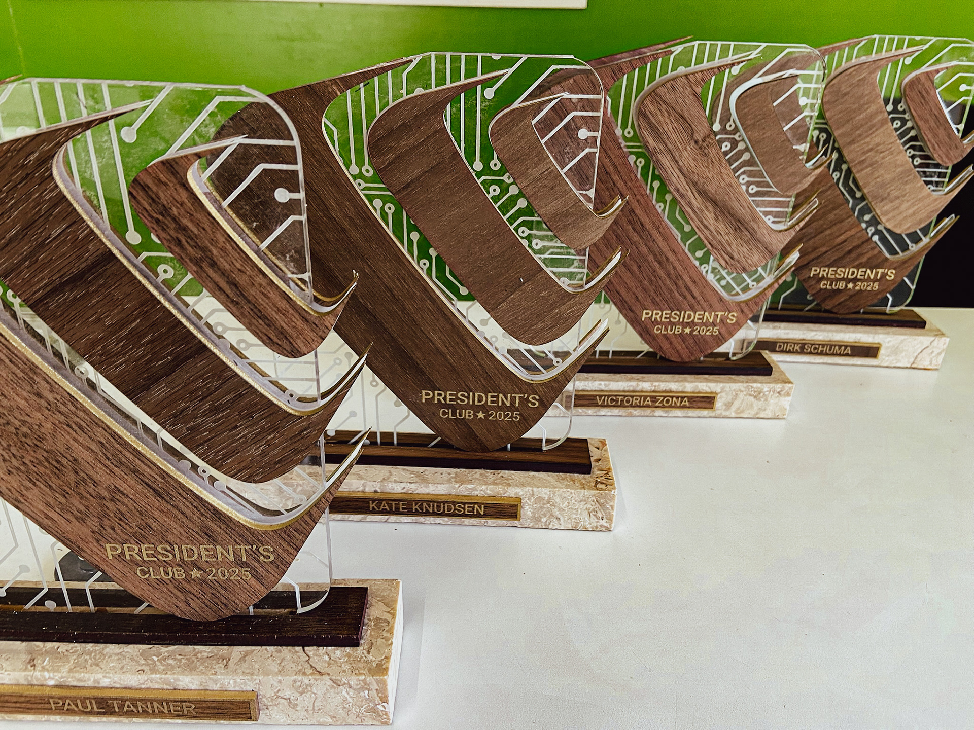 Our scope included personalised cherry wood name tags, event-branded coconuts that embraced the destination experience, and custom awards for top sales performers. The awards themselves were crafted from Authentic Anguilla Limestone, acrylic, and walnut, combining organic textures with layered forms and circuit-inspired detailing—symbolising strength, precision, and innovation.