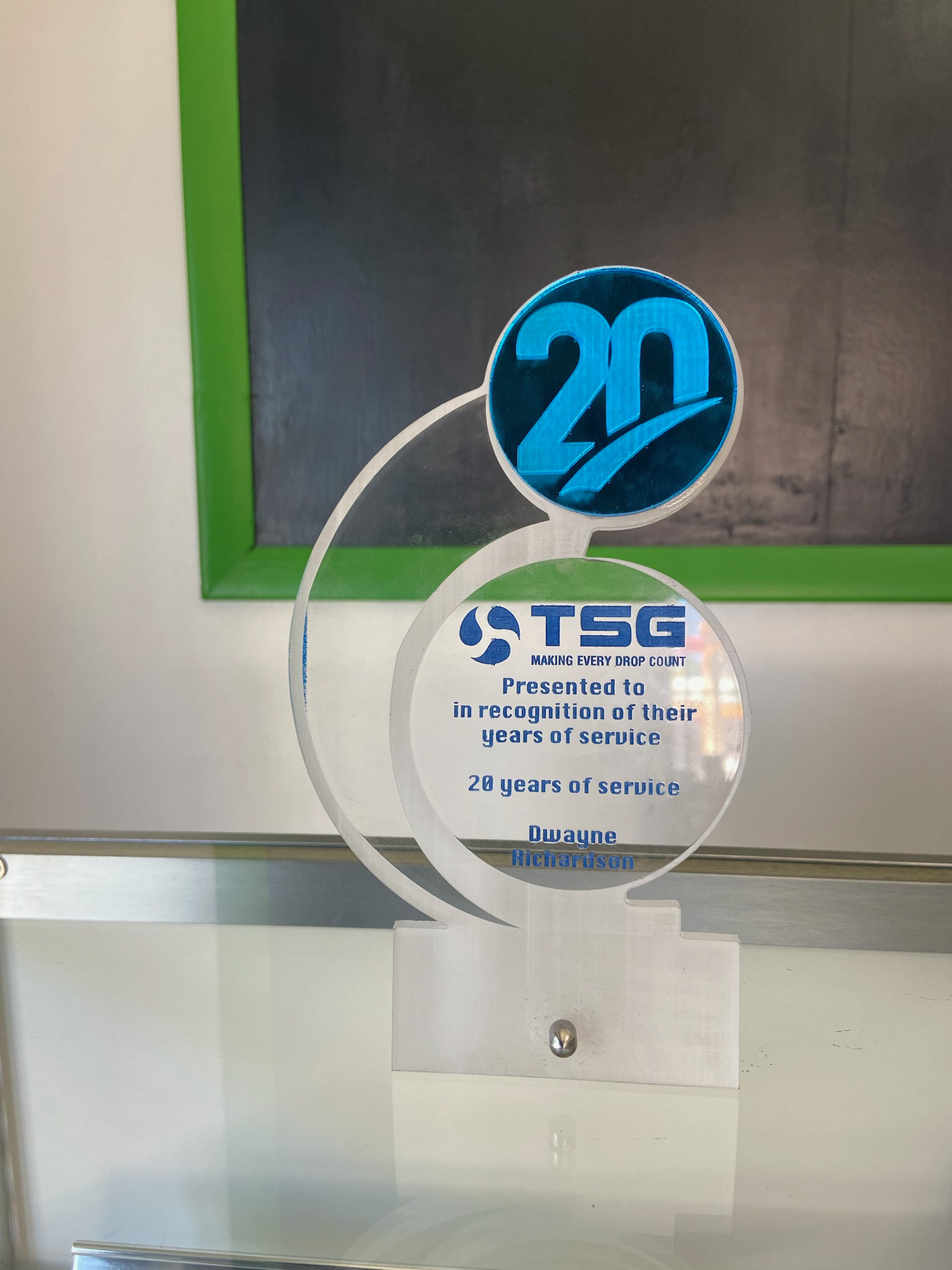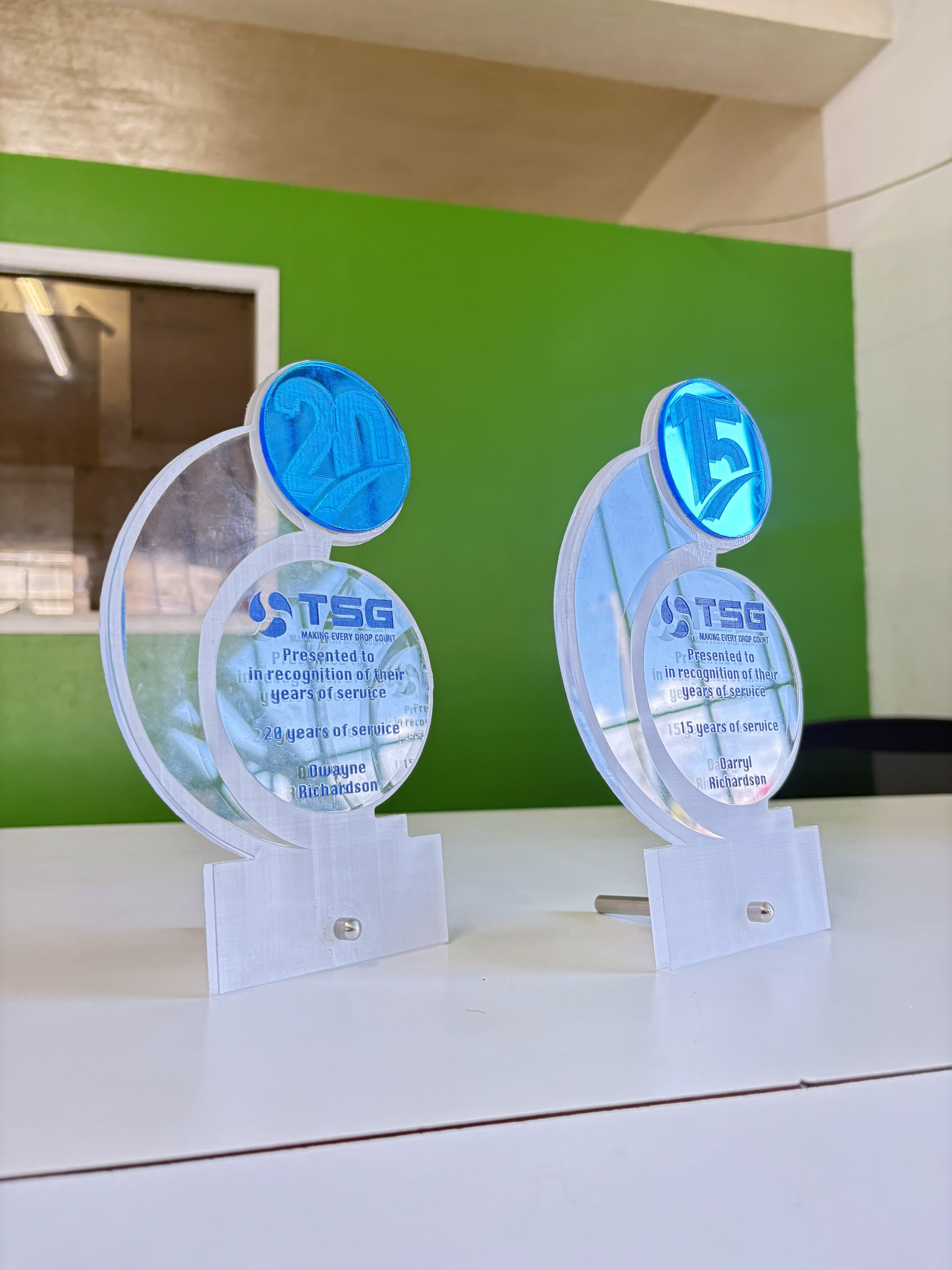 Custom clear acrylic stand-off awards created for TSG Water, honouring team members for their years of dedicated service. Designed with layered acrylic elements and bold blue accents, each award reflects clarity, progress, and reliability—values at the core of TSG Water’s mission of making every drop count.