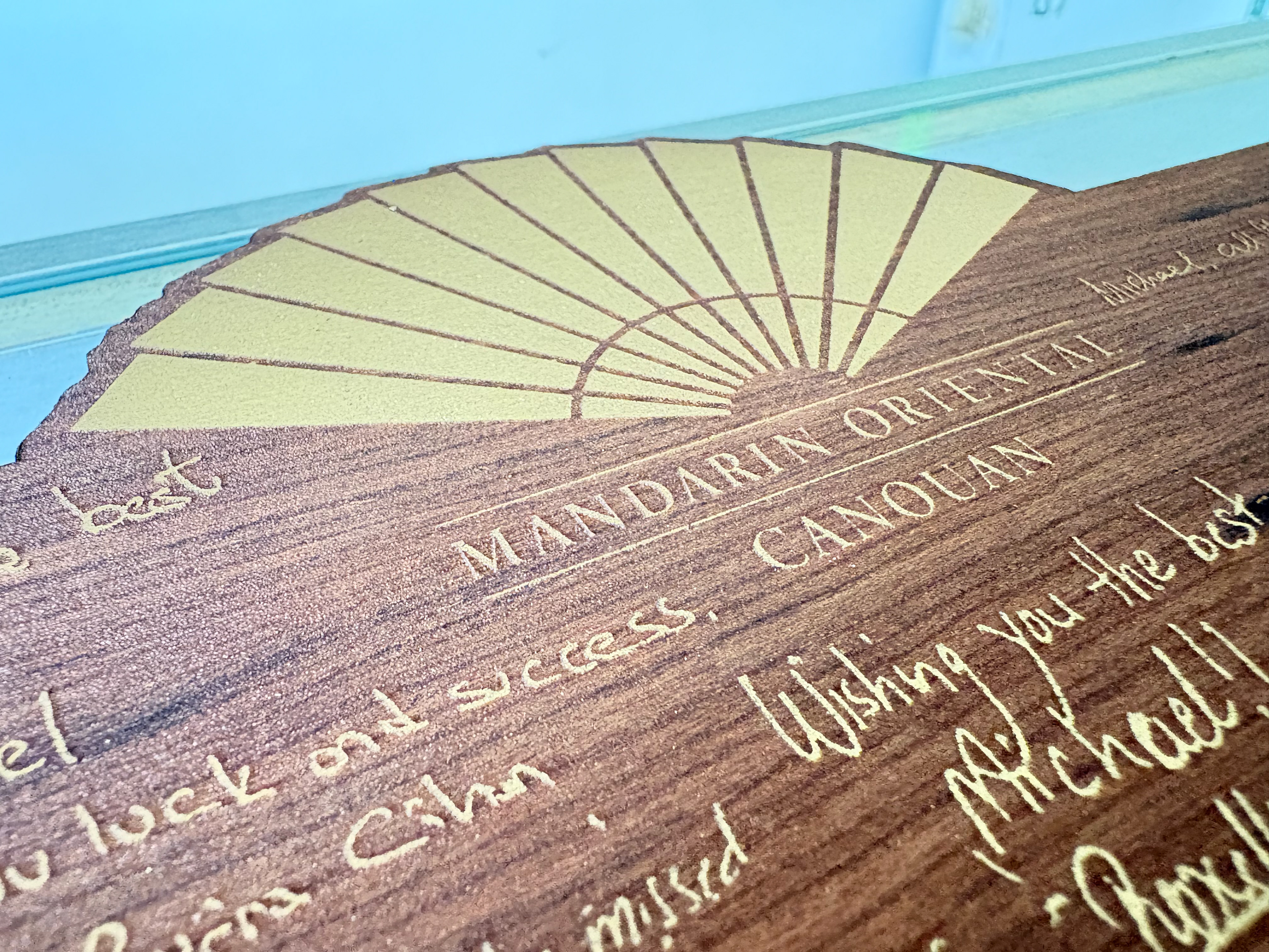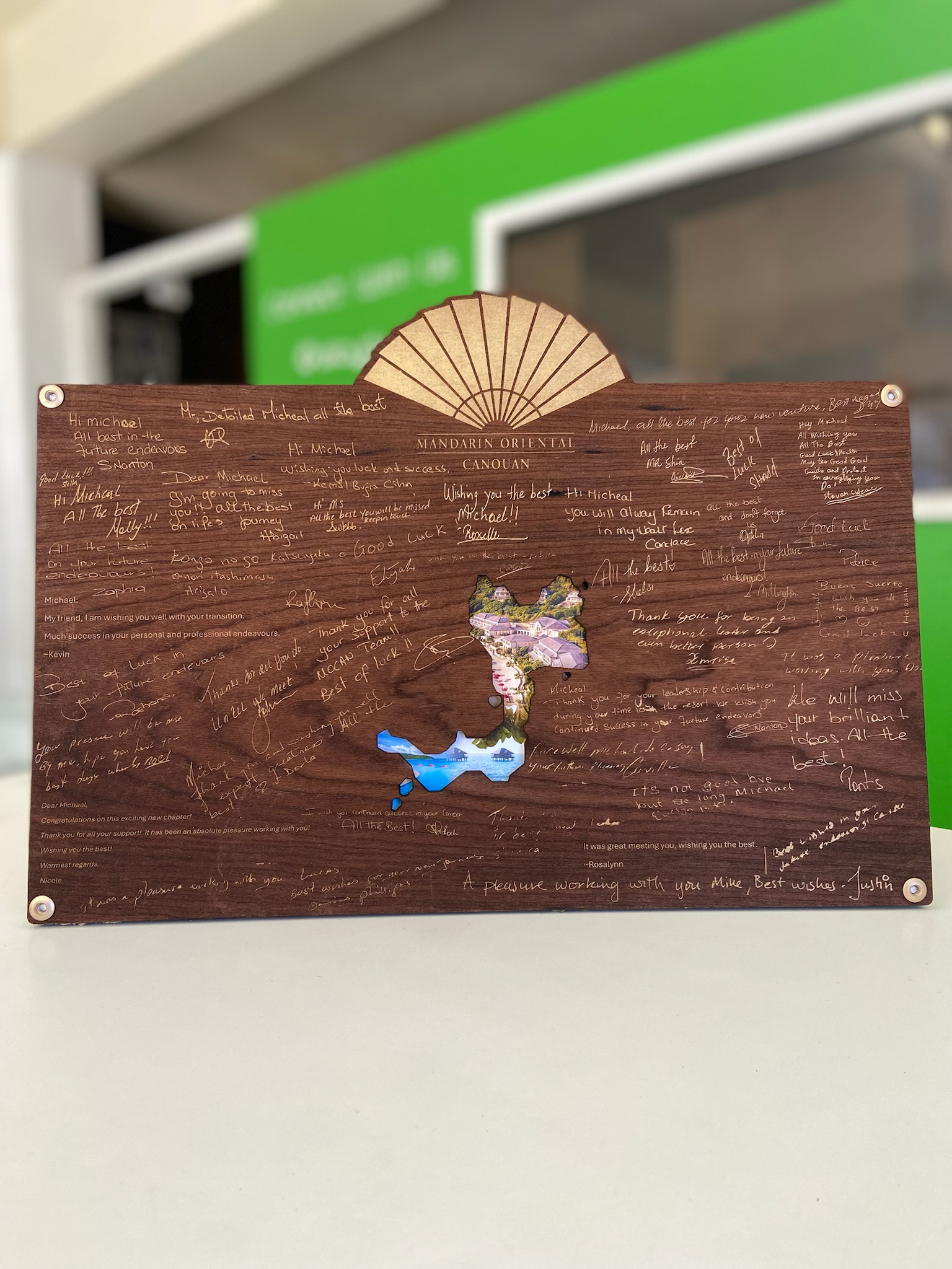 Mandarin Oriental is globally renowned for blending timeless elegance with meaningful human connection, and this plaque embodies that philosophy—bringing together handwritten messages, well wishes, and signatures into a single, lasting keepsake. Crafted in rich wood with layered details, the piece balances warmth and sophistication, mirroring the brand’s approach to hospitality where people, stories, and experiences are always at the centre.