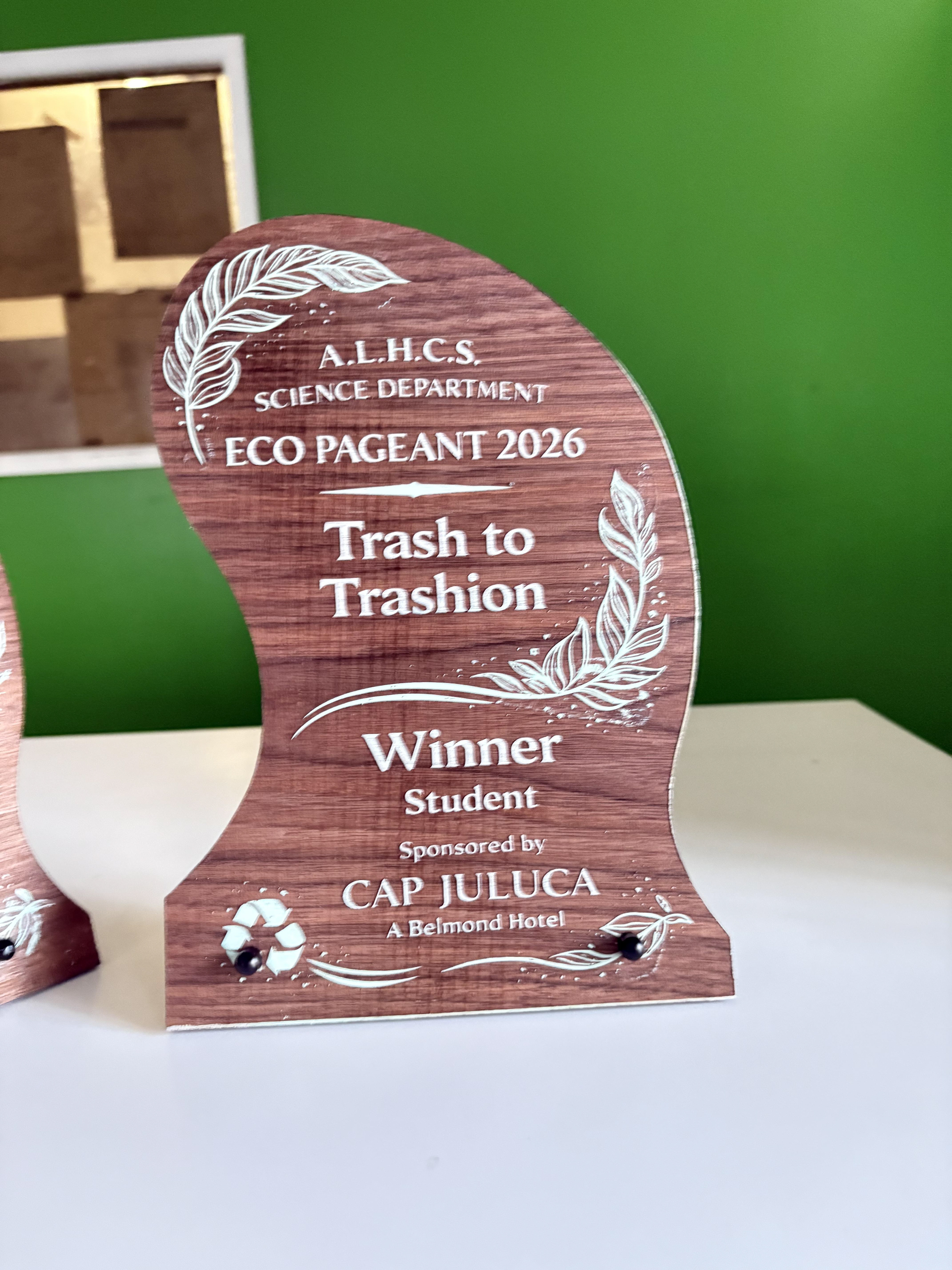 Custom-designed for the ALHCS Eco Pageant, these awards celebrate creativity, environmental awareness, and purposeful design. Created for the Trash to Trashion theme, each piece reflects the spirit of sustainability—transforming conscious ideas into meaningful recognition.