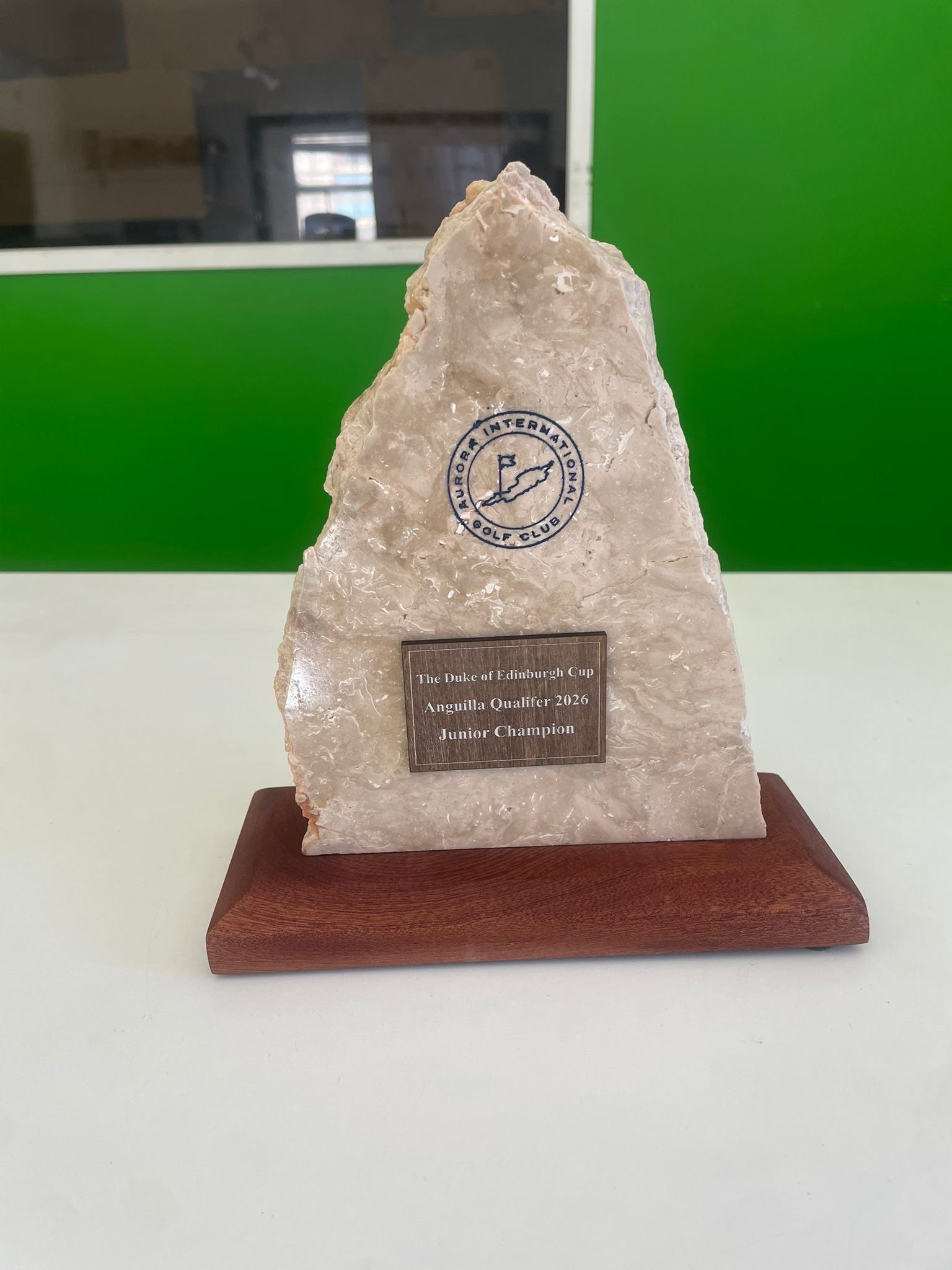 This Authentic Anguilla Limestone Award is crafted from a natural, unaltered piece of locally sourced limestone, transformed into a distinctive and timeless golf trophy. The triangular limestone form paired with a polished mahogany base represents the standard award style used across all tournaments at Aurora International Golf Club, creating a consistent and recognizable symbol of achievement.