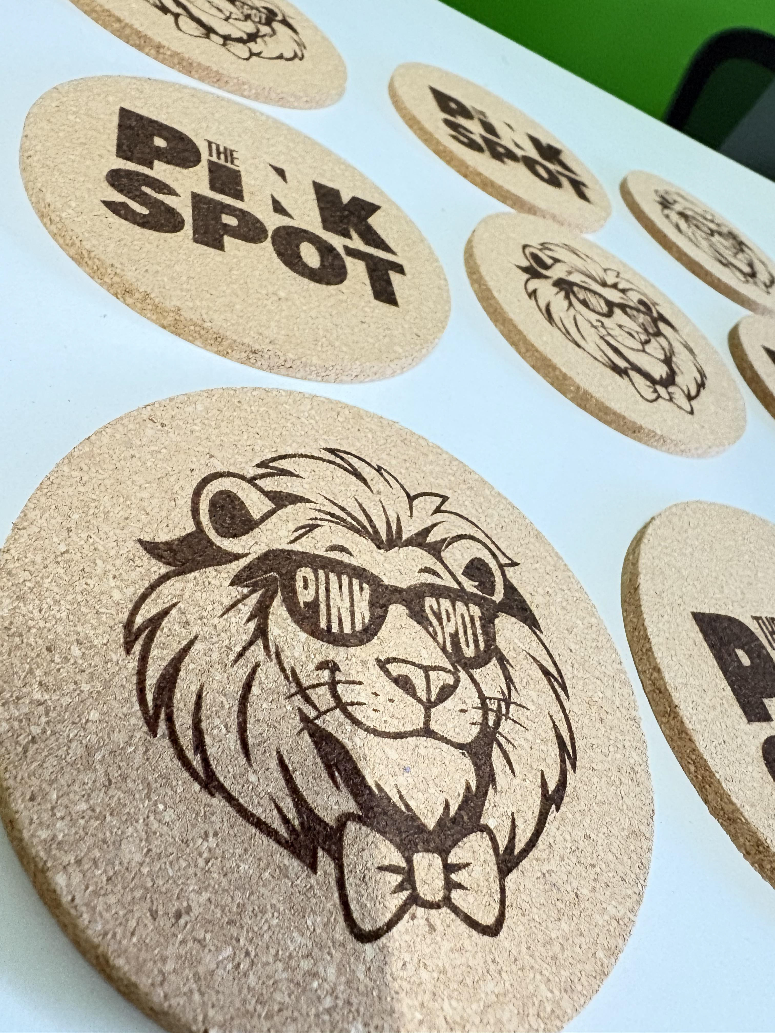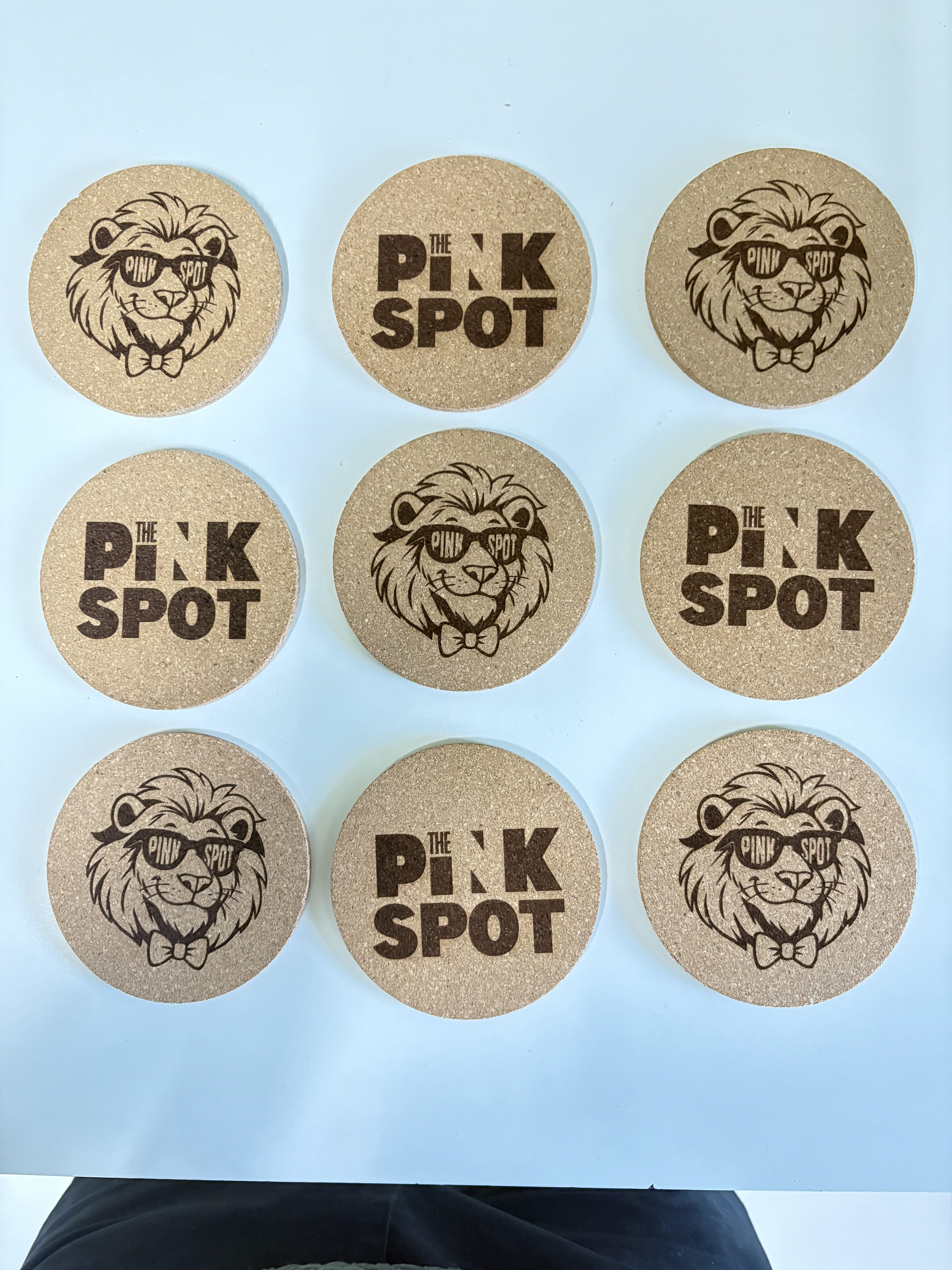 Custom cork coasters designed for The Pink Spot, bringing their bold personality straight to the tabletop. Featuring the signature lion logo and clean typographic mark, each coaster blends playful branding with natural cork—durable, functional, and effortlessly stylish.