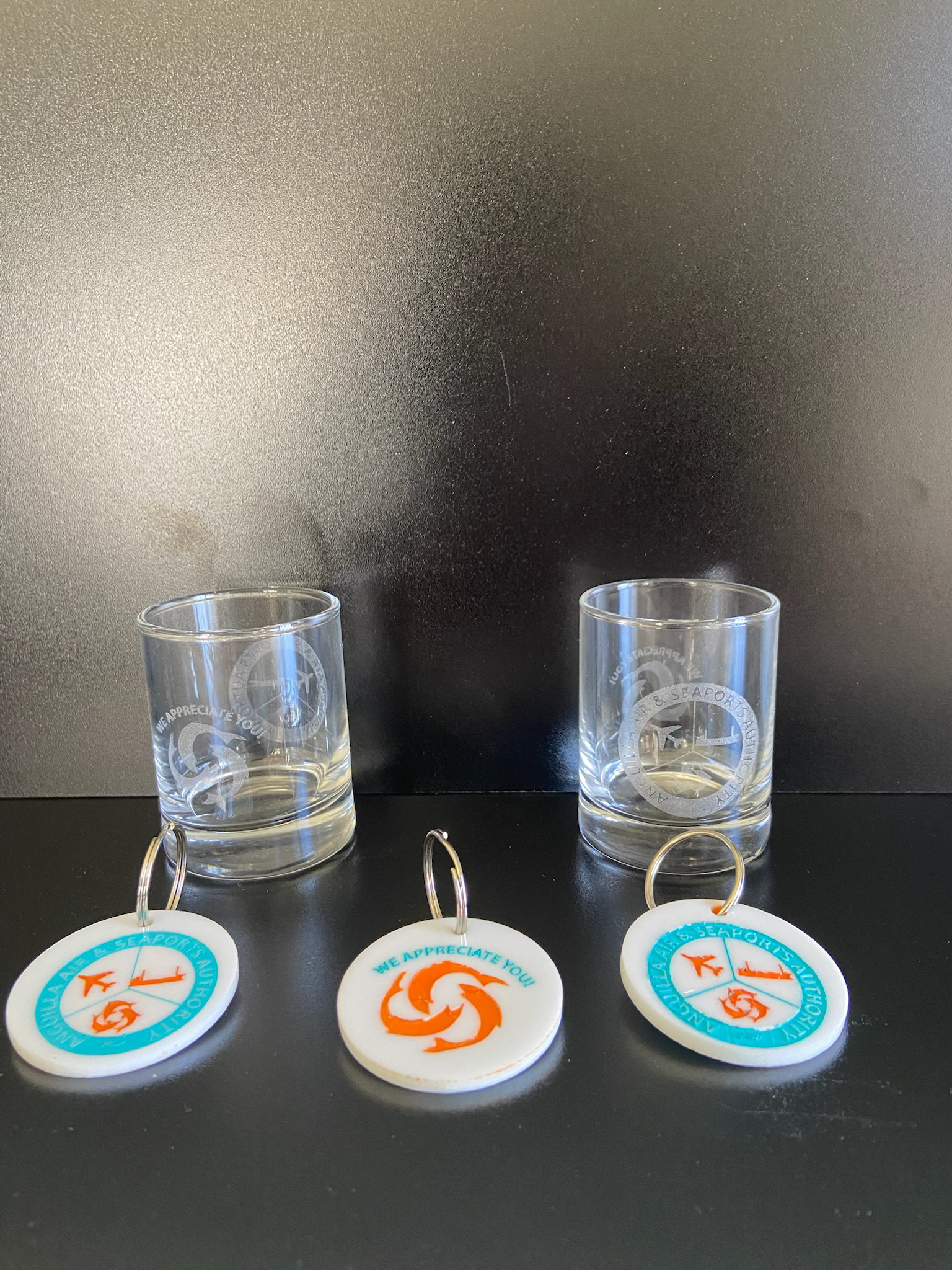 Custom gift bag tokens created for the Anguilla Air & Sea Port Authority, designed as meaningful keepsakes that reflect appreciation and connection. This collection features laser-engraved shot glasses paired with precision laser-cut and engraved acrylic keychains, each incorporating the Authority’s branding and message of gratitude. Thoughtfully crafted to be both functional and memorable, these pieces serve as lasting mementos that celebrate service, partnership, and Anguilla’s vital gateway by air and sea.